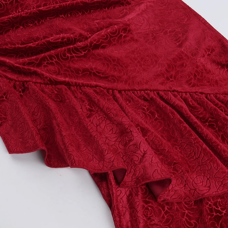 The Women's Gothic Irregular Hem Rose Halter Fishtail Dress is a stunning and dramatic piece that effortlessly combines gothic elements with bold design features. The dress features an irregular hemline that adds a touch of asymmetry and edge to the overall look, while the halter neck design exudes sophistication and allure. The fishtail silhouette creates a flattering and elegant shape that hugs the curves in all the right places.