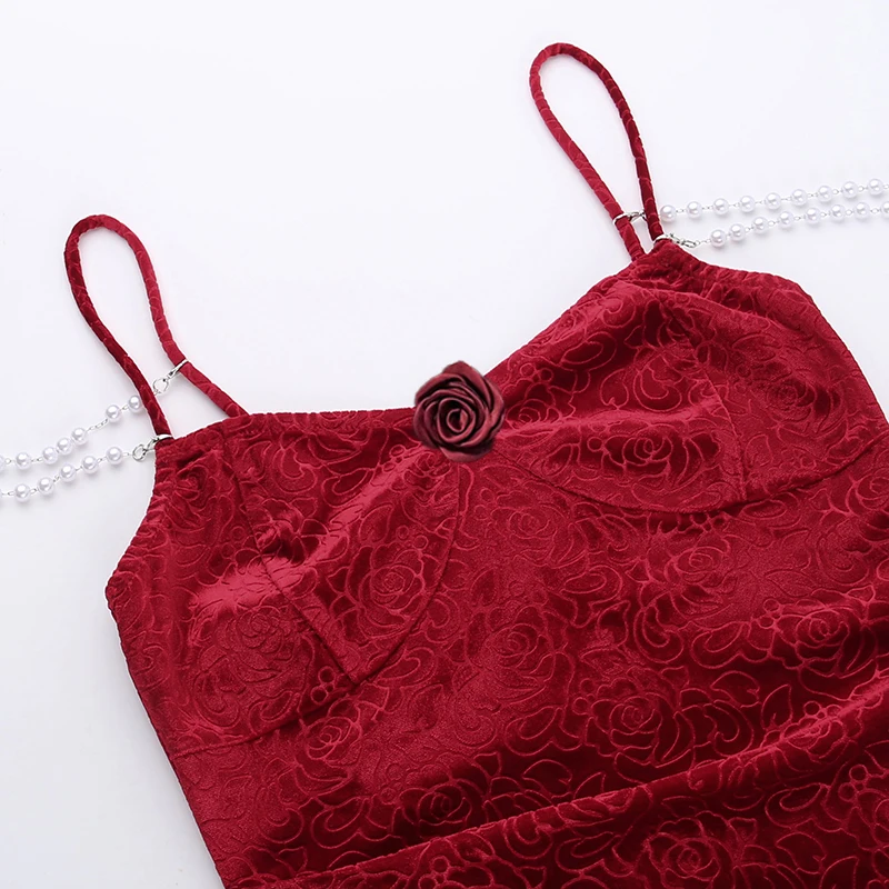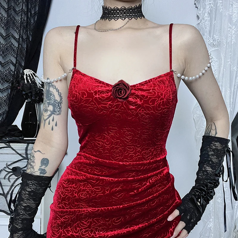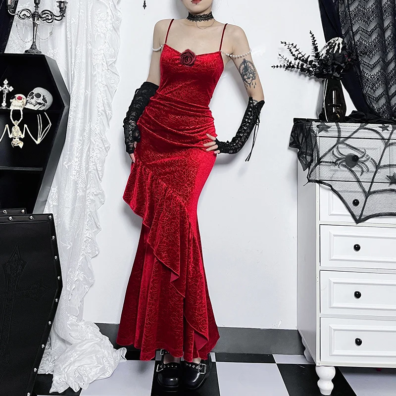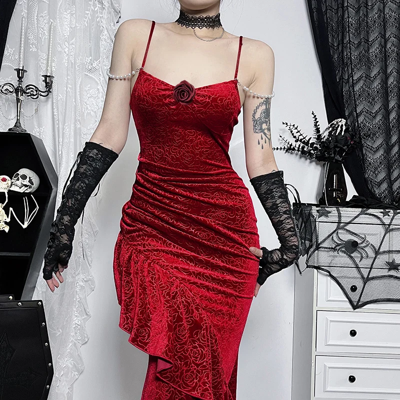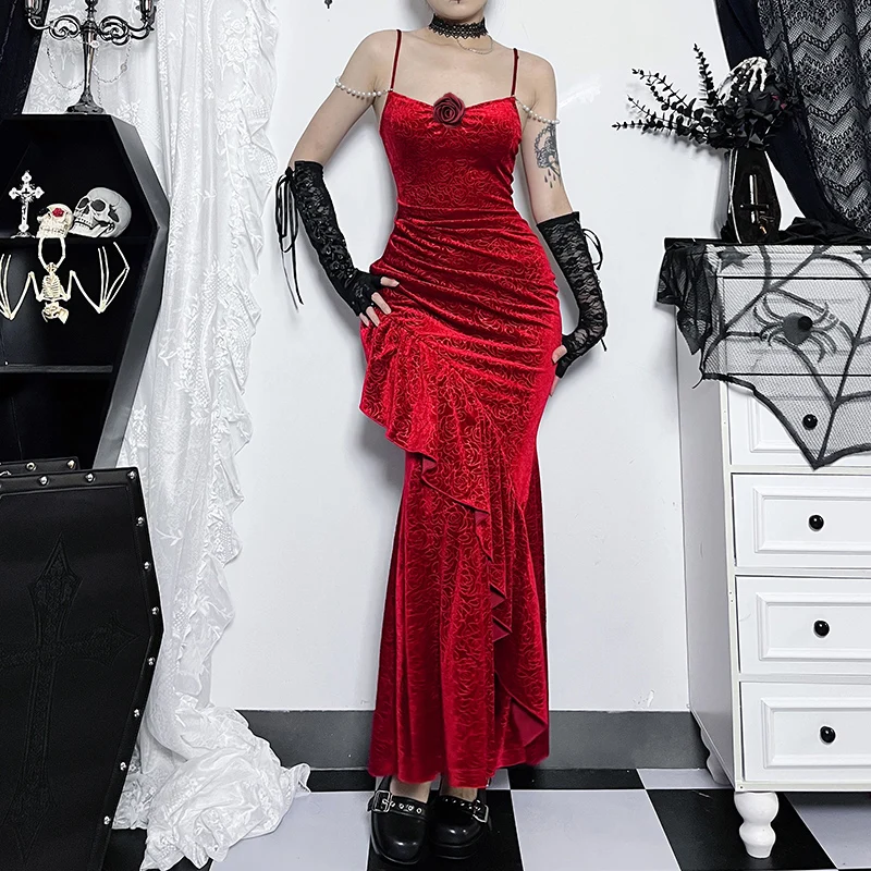 Embellished with rose details, this dress exudes a dark romantic vibe that is both captivating and mysterious. Perfect for special occasions such as parties, proms, or gothic-themed events, this dress allows you to make a bold fashion statement and showcase your unique sense of style. Whether paired with heels or boots, this dress will make you stand out and command attention wherever you go.