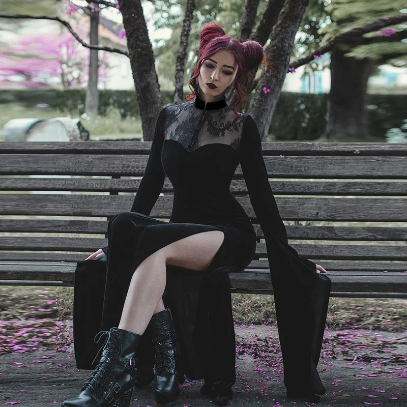 Women's Gothic Split Lace Hollow Patchwork Long Flared Sleeve Dresses