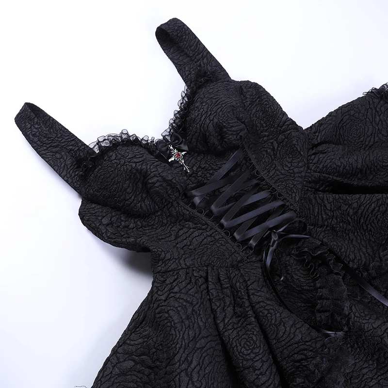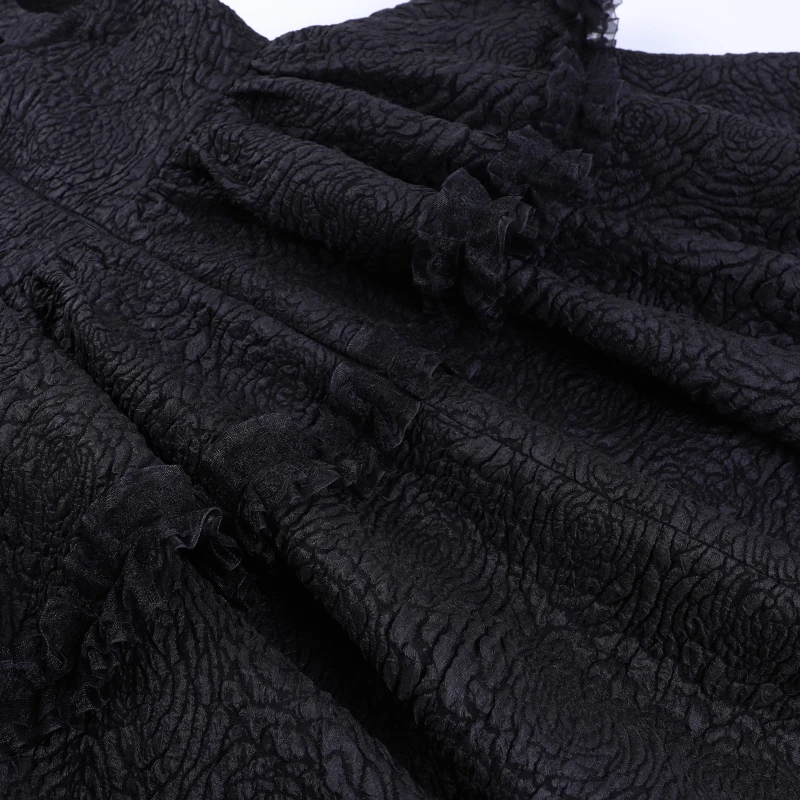 The lace fabric creates a sense of mystery and allure, while the ruffle trims soften the silhouette and add a whimsical charm. The combination of these elements gives the dress a timeless and ethereal quality that is perfect for any formal occasion or gothic-themed event.