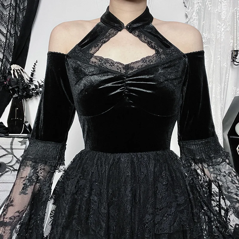 Women's Halter Contrast Lace Flare Sleeve Dress