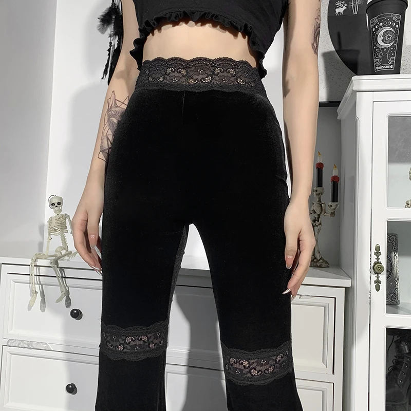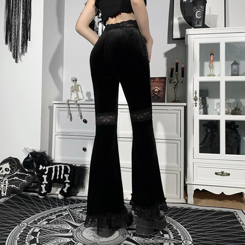 Ideal for those who want to make a bold fashion statement, these gothic pants are perfect for pairing with a variety of tops to create a versatile and eye-catching outfit. The combination of the flared silhouette, lace detailing, and slim fit design makes these pants a standout piece that is sure to turn heads wherever you go. Embrace your inner gothic style with these elegant and unique pants.