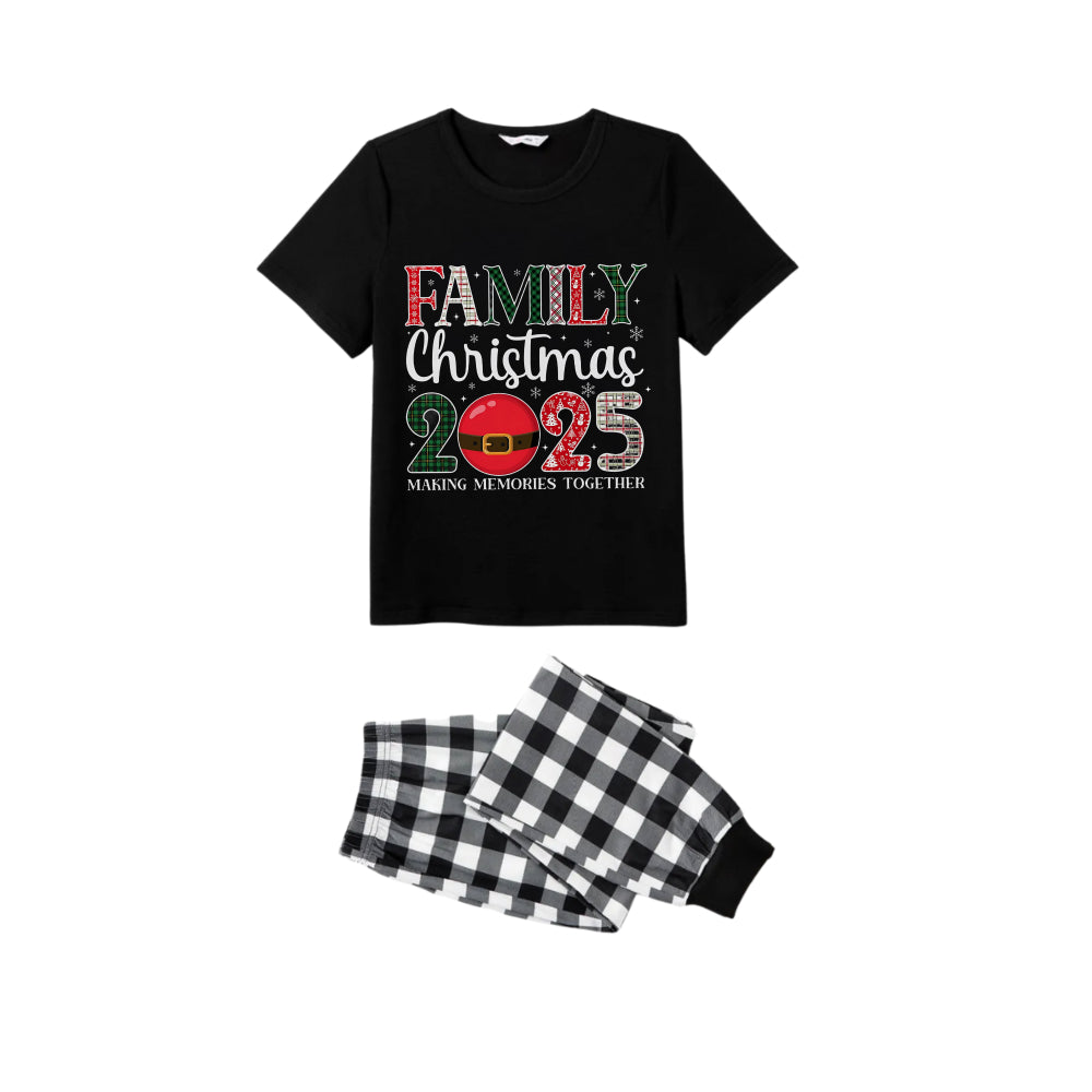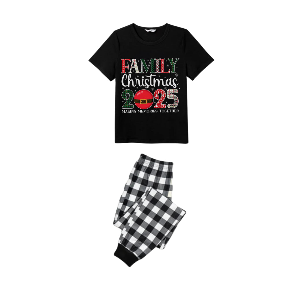 Black and White Plaid Short Sleeve Christmas Pajamas Set With Santa Motif Print