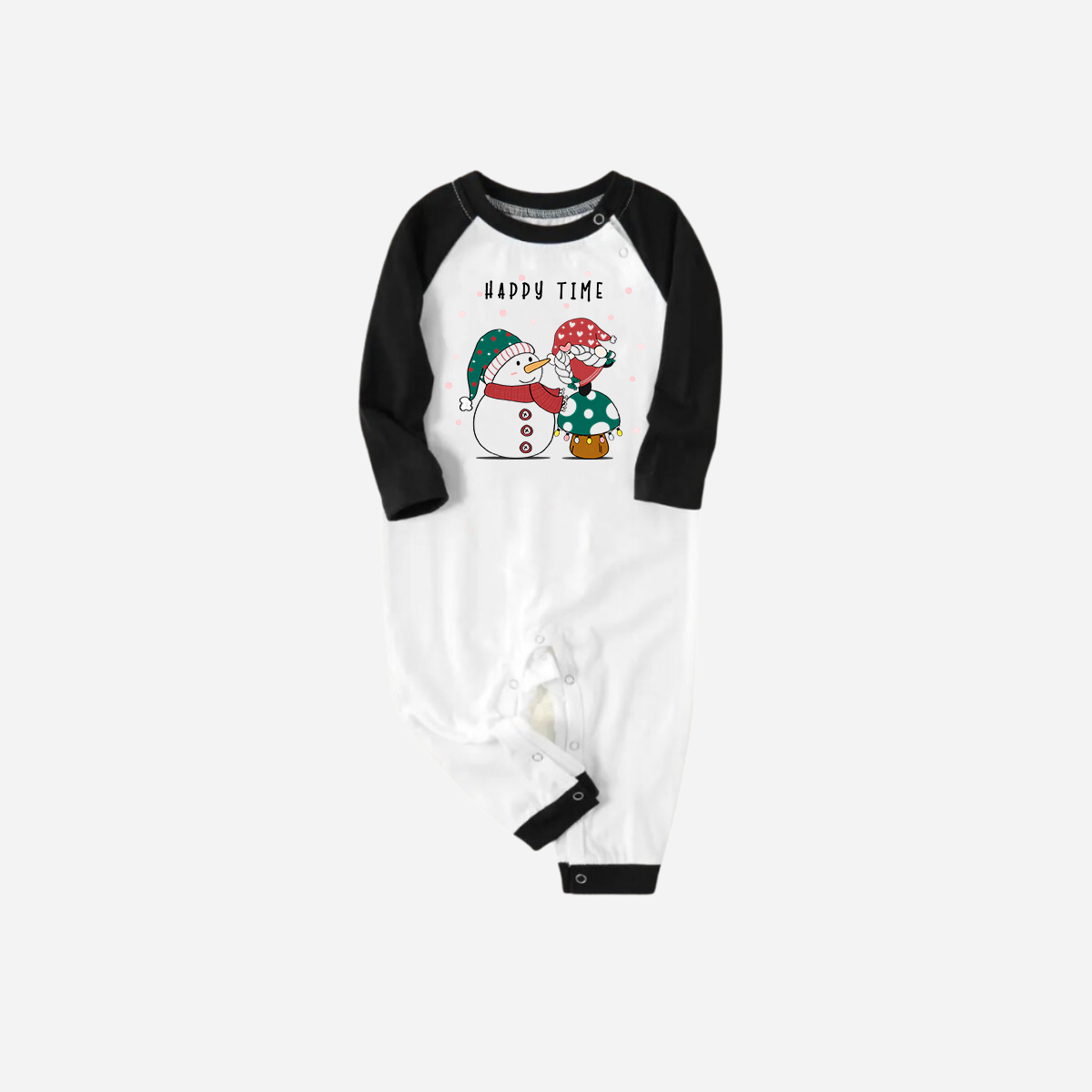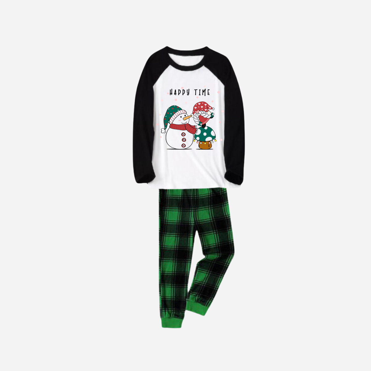 Black Raglan Top Green Plaid Christmas Pajamas Set With Snowman and Gnome and "Happy Time" Text Print