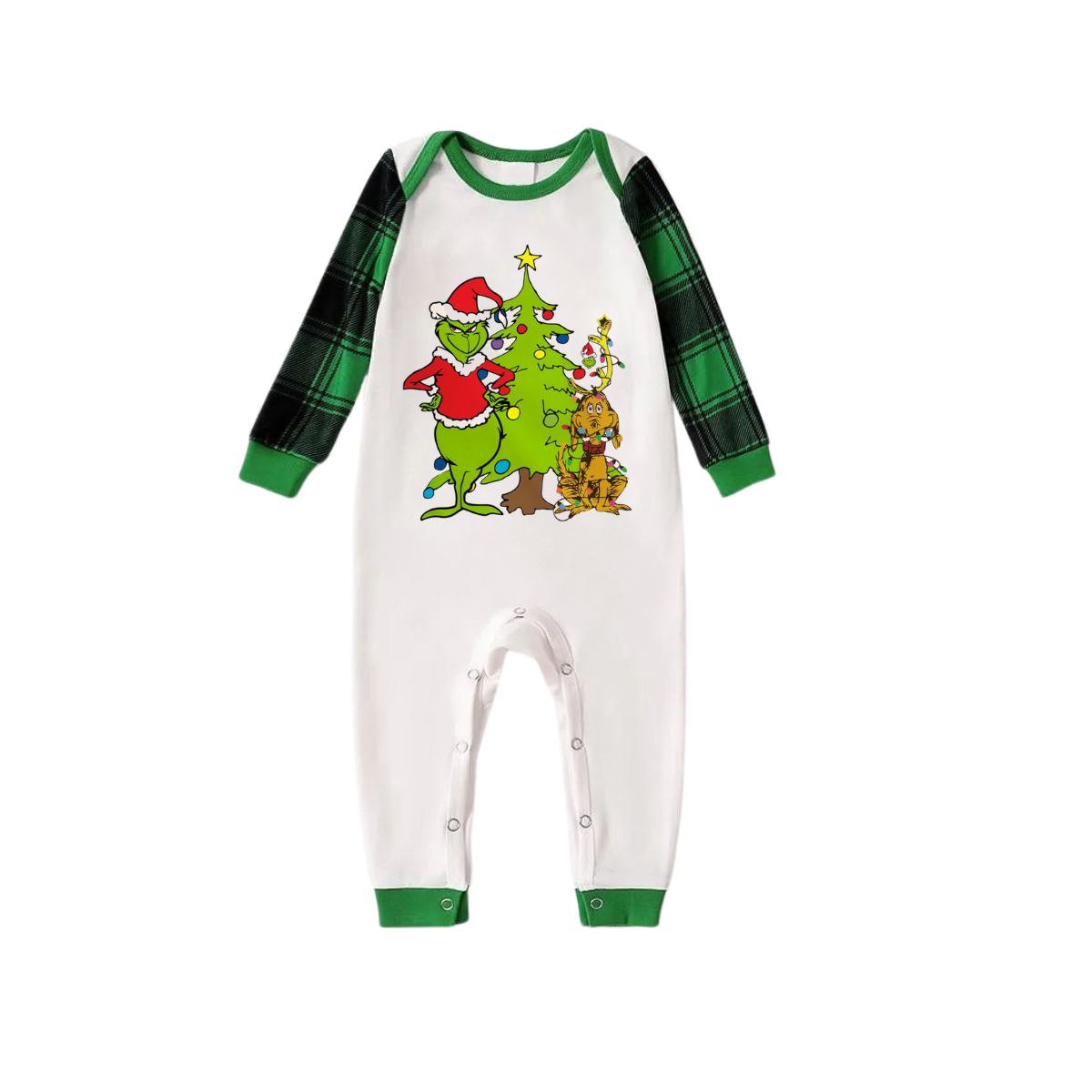 Cartoon Pattern and Christmad Tree Printed Green Plaid Long Sleeve Christmas Family Pajamas