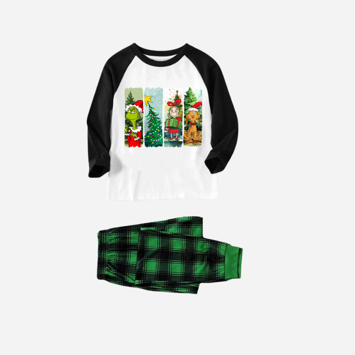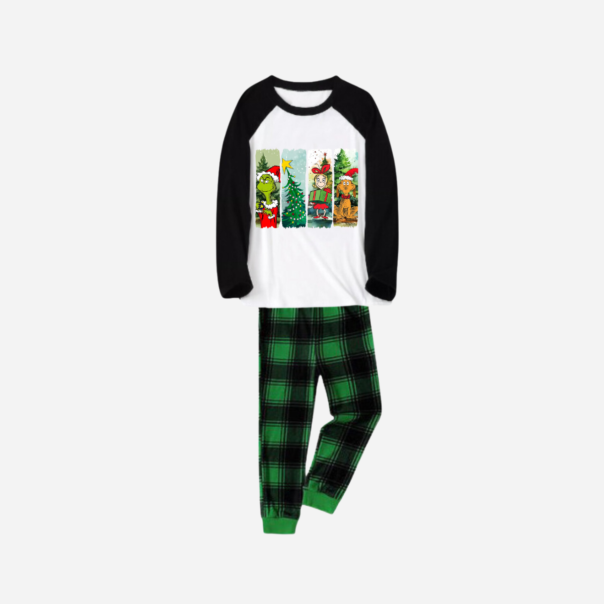 Christmas Cartoon Family Christmas Pajamas Set - Black and White Top with Green Plaid Pants
