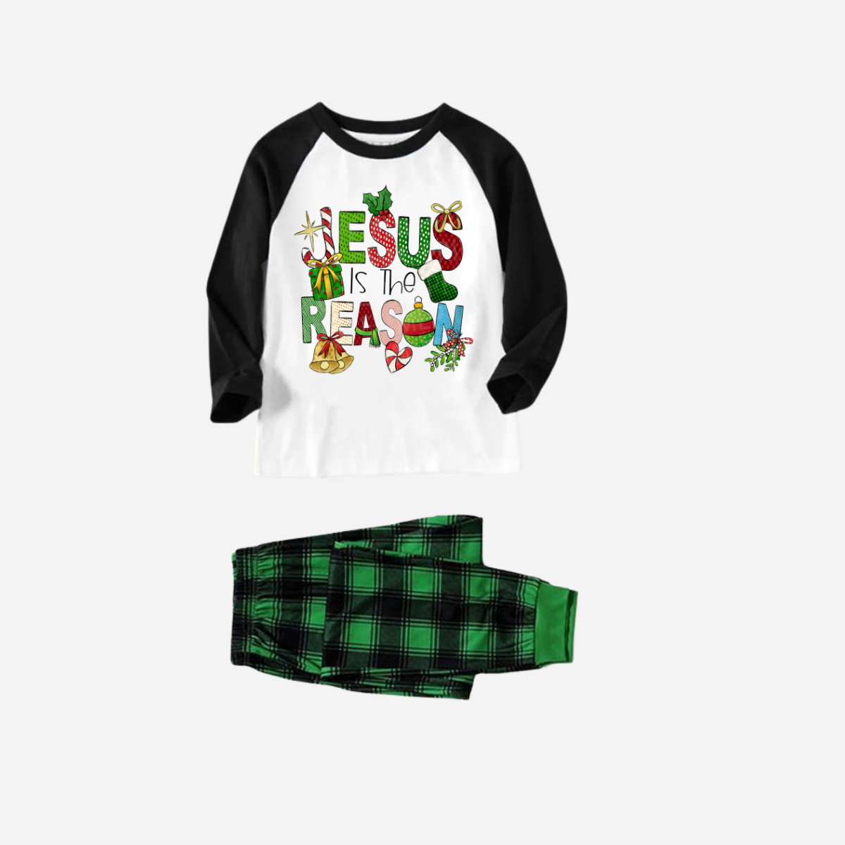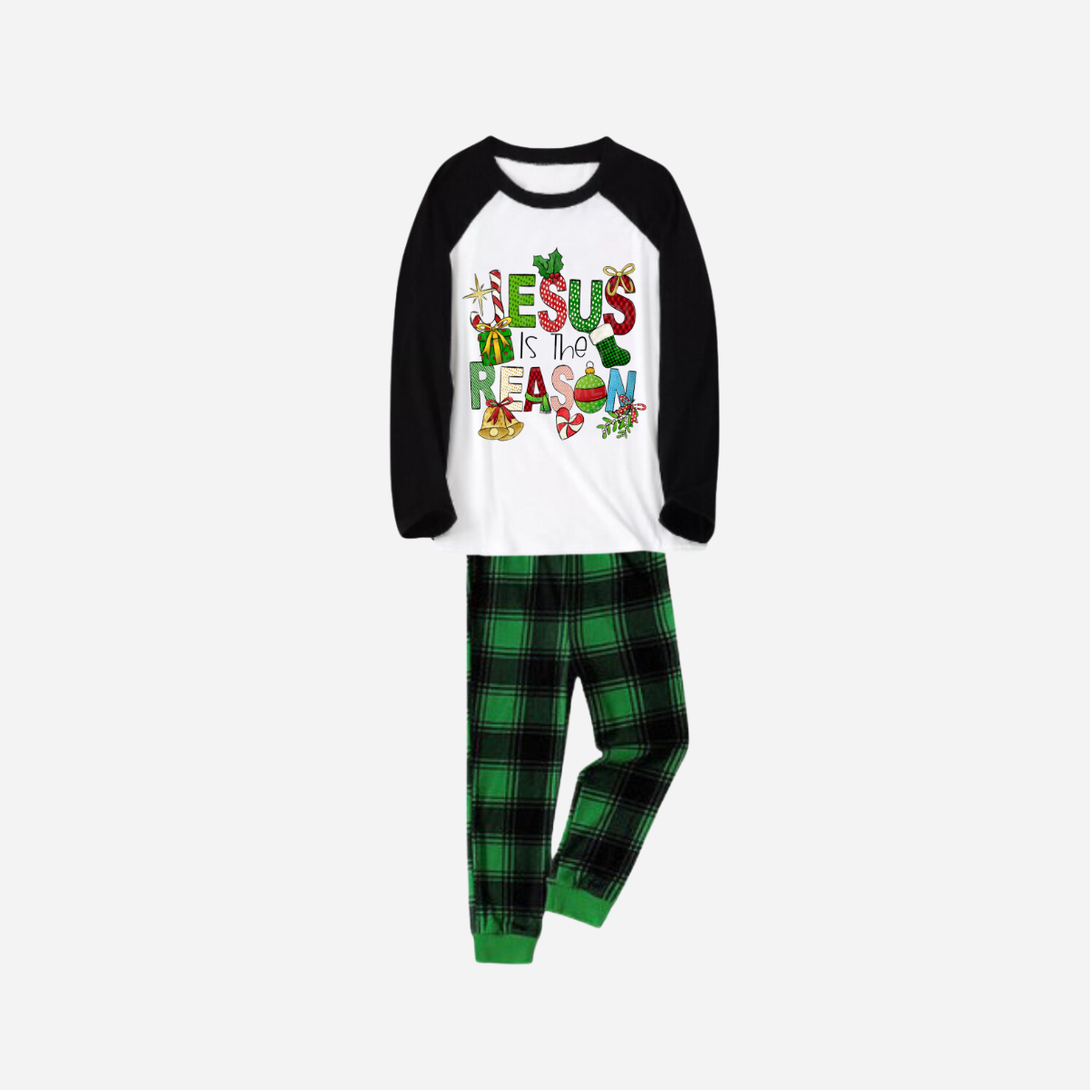 Christmas Cartoon Family Christmas Pajamas Set - Black and White Top with Green Plaid Pants and “Jesus is the Reason” Design