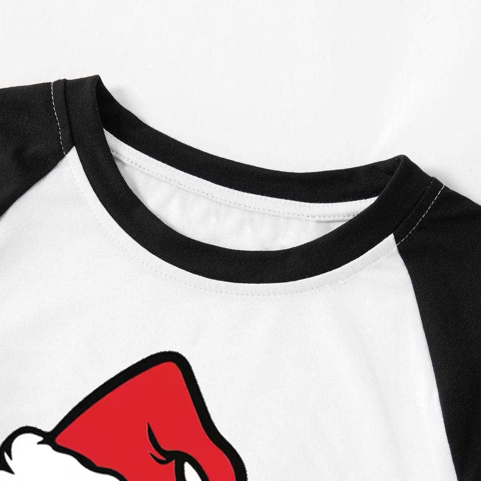 Christmas Hat Cartoon Print Splice Contrast Top and Black and Gren Plaid Pants Family Matching Pajamas Sets