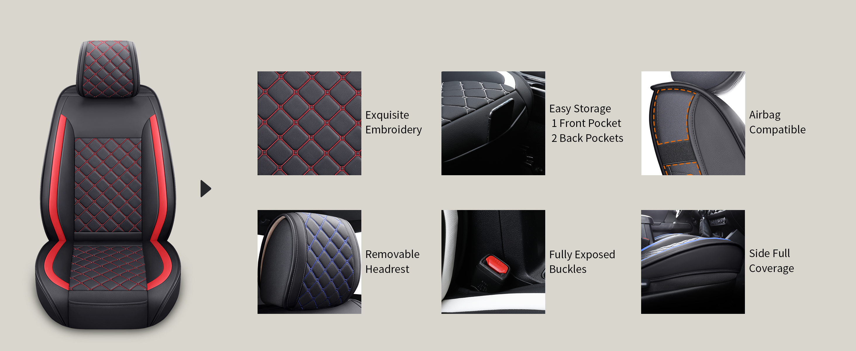 - In addition, we have also specially considered the compatibility of the airbag, and reserved enough space on the car seat cover that the airbag will never be blocked. There are also two pockets on the front seat back of the car seat cover for easy storage of small items.