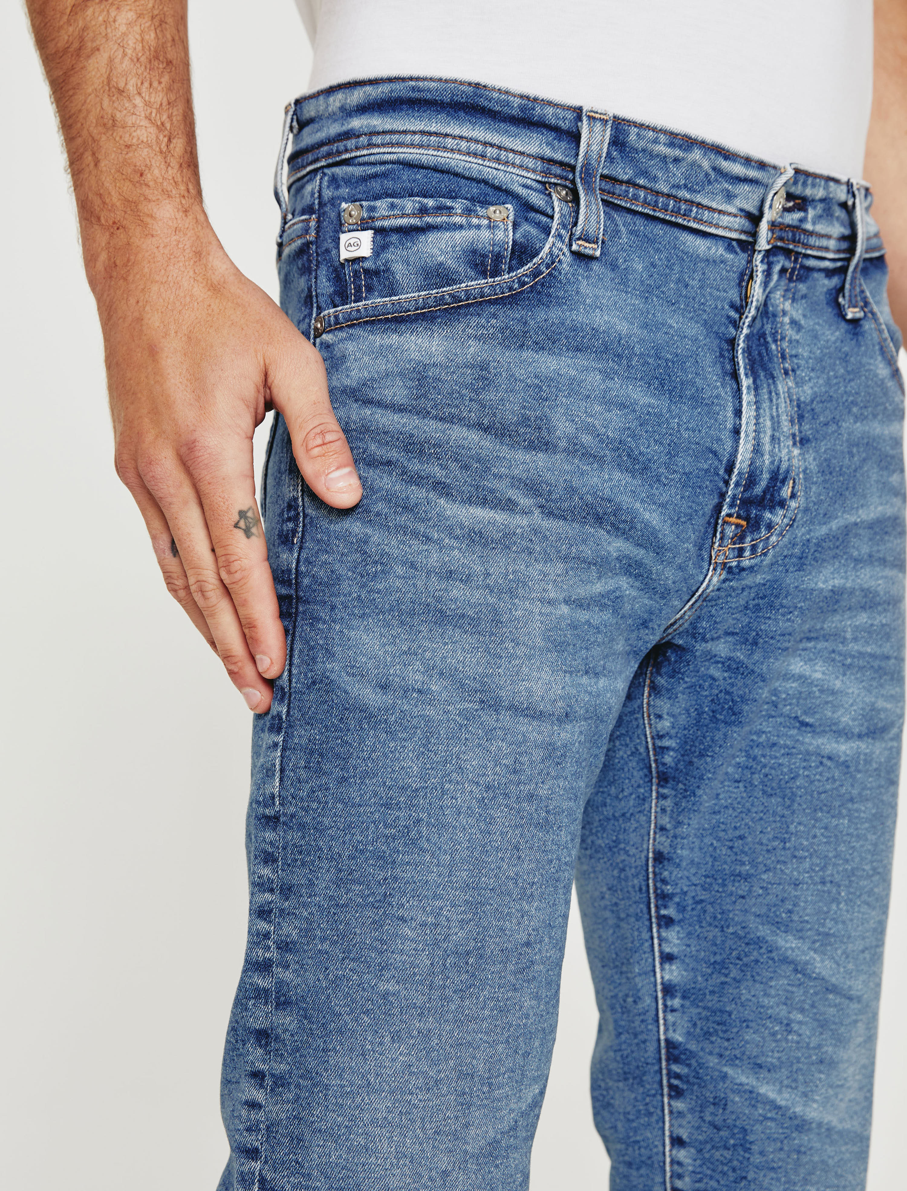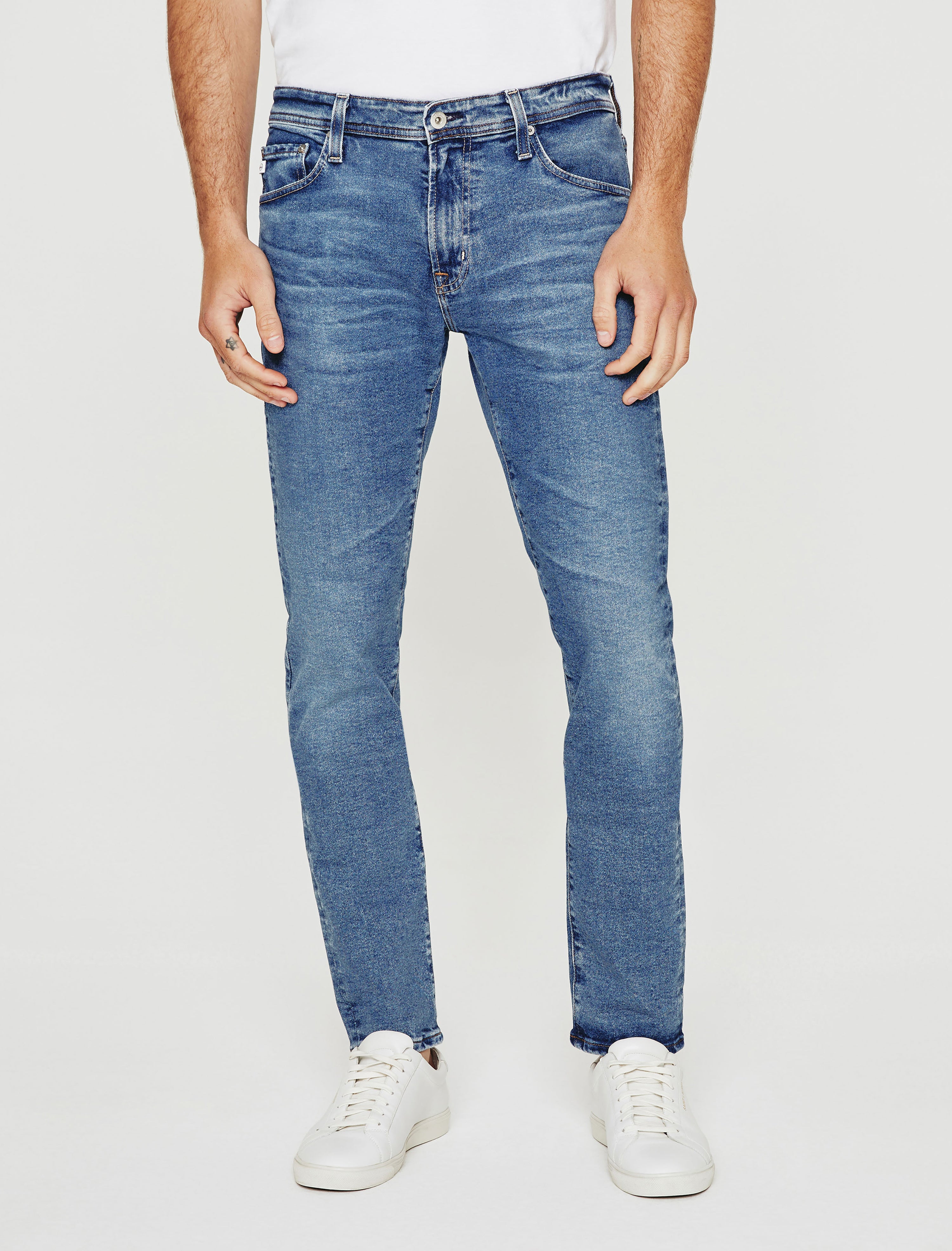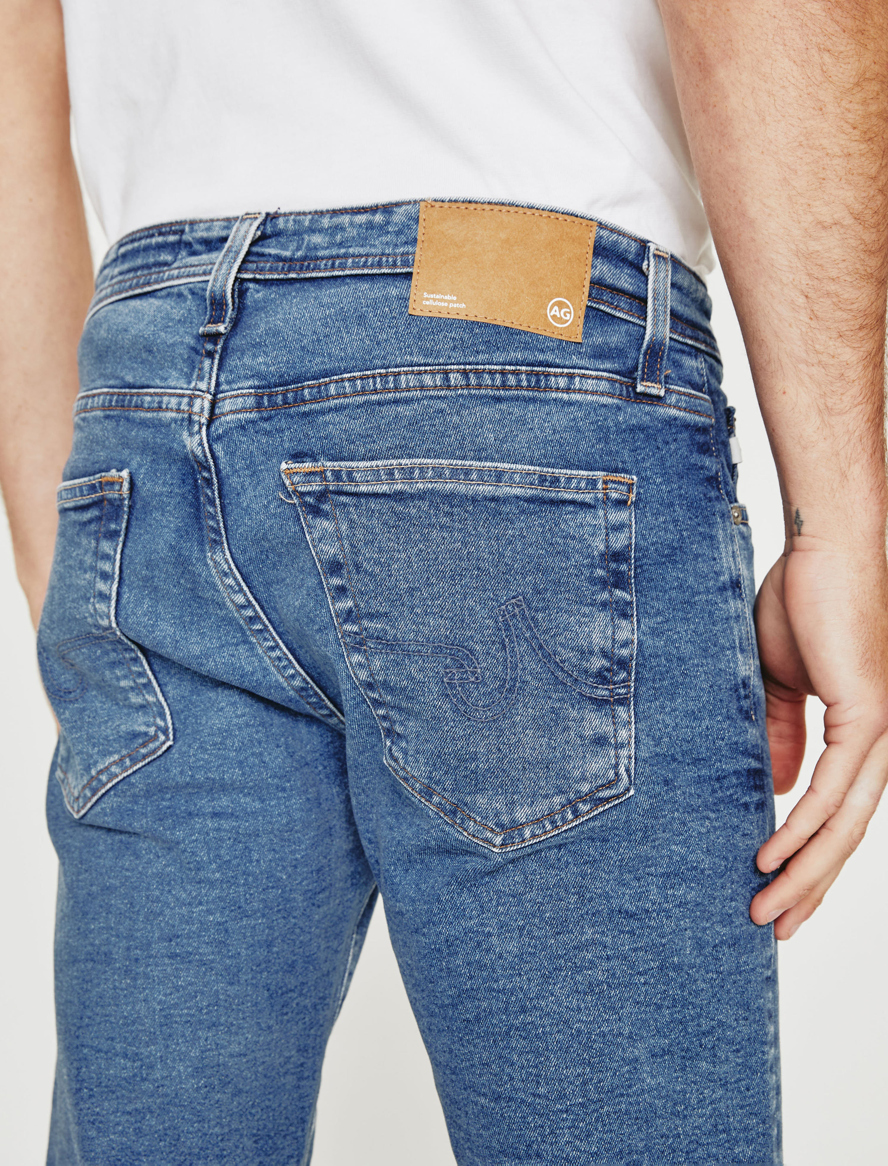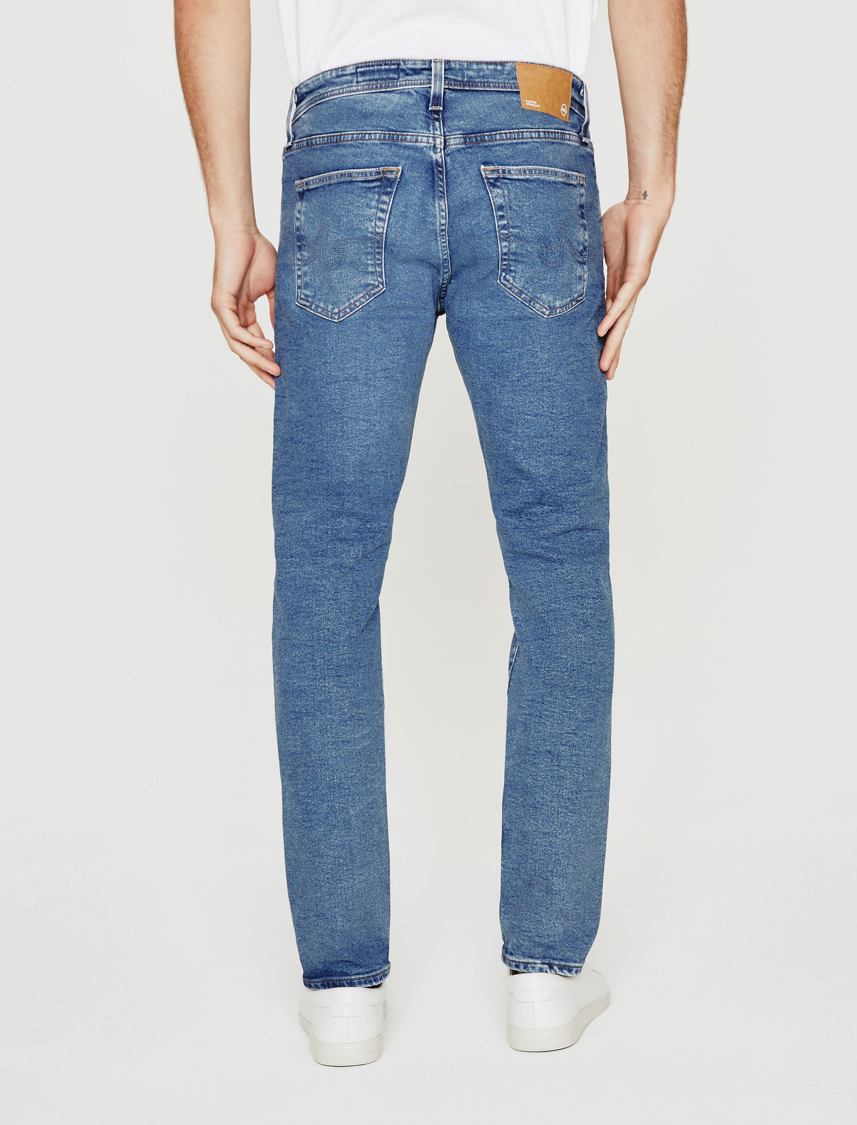 Dylan is a men's slim skinny jean made using AG's eco-friendly AG Vapor Wash™ technology. This pair comes in 11 oz. Classic Comfort Stretch Denim with a faded medium-blue wash. Cut slim through the thighs and tapered at the leg opening, the pair features traditional five-pocket construction with an elevated look and premium feel. Our AG Vapor Wash™ process significantly reduces the use of water, chemicals, and energy to lessen environmental impact. Finished with a vegan and 100% biodegradable cellulose patch at the back waistband.