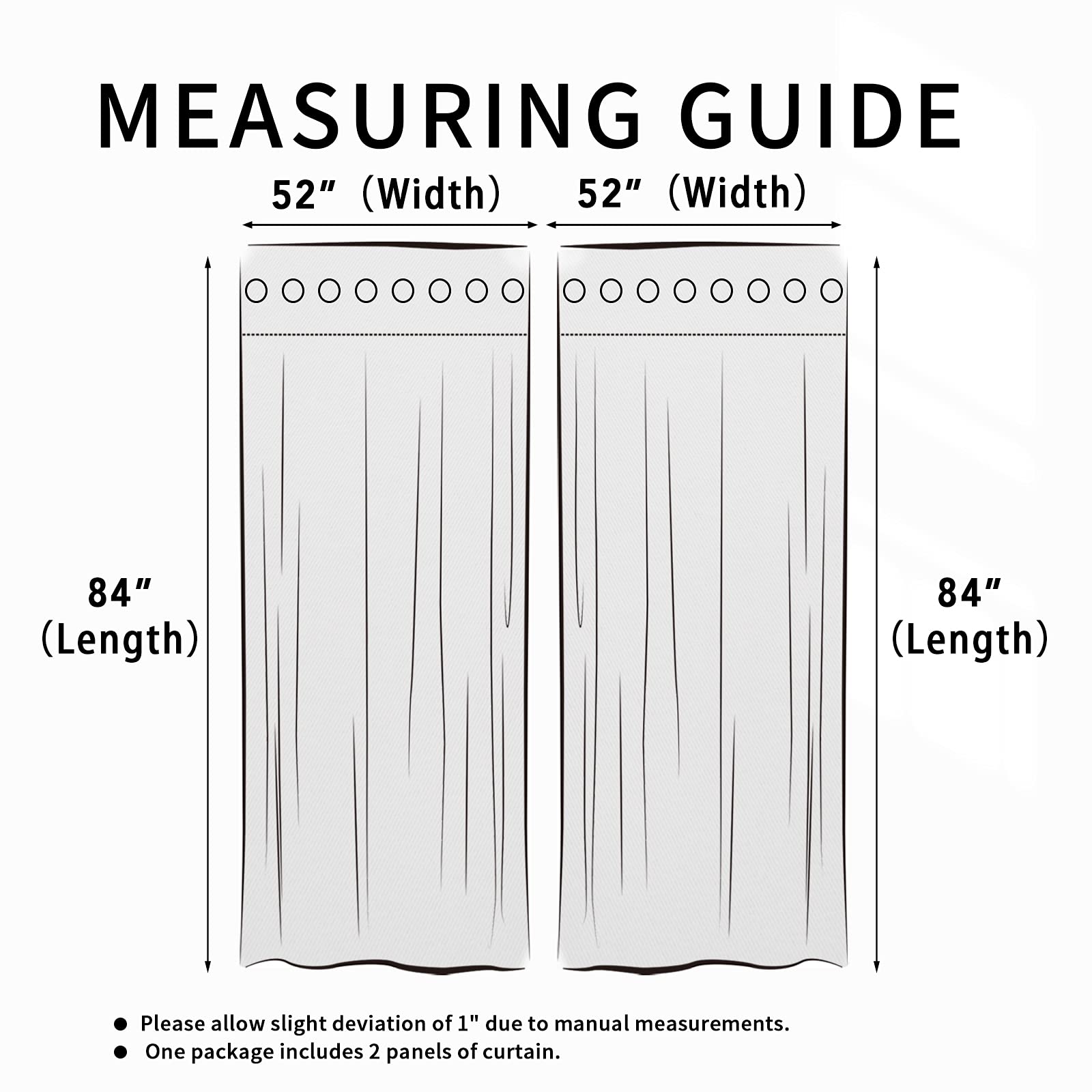 Curtain Package: The curtain is sold in set of 2 panels. Each measures 52 inches wide by 84 inches long, with 8 anti rust grommets (1.6 inch inner diameter) on top which fit well most curtain rods for effortlessly installation and sliding.