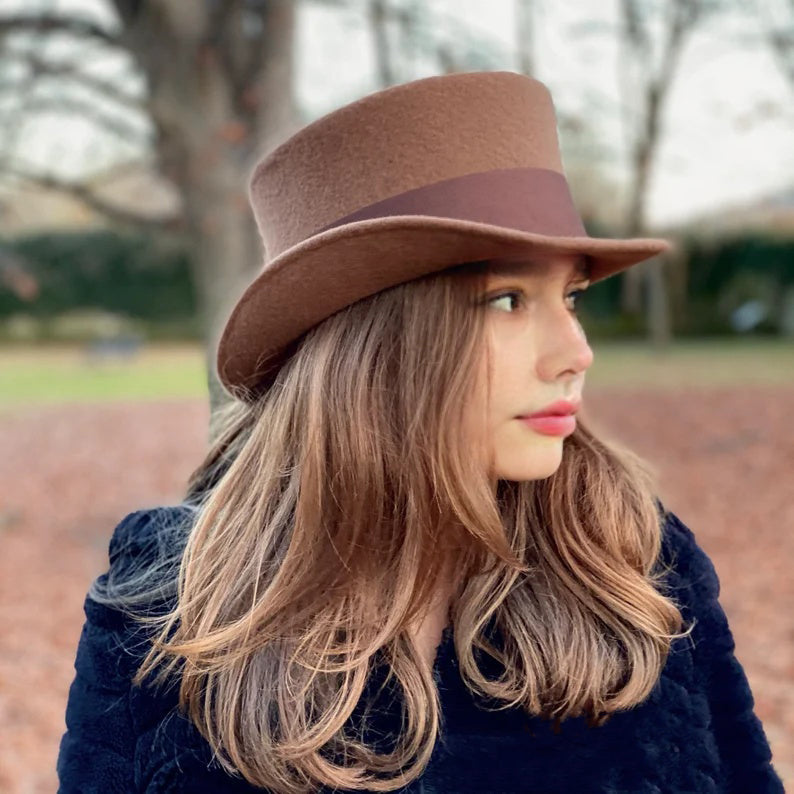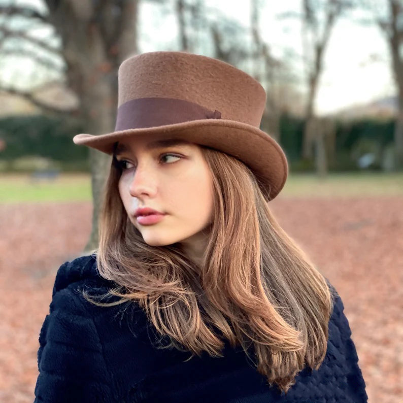 Short crown top hat embellished with a 50 millimeters wide grosgrain ribbon. Edwardian top hat ideal for everyday and special ocasions such as weddings, cocktails or parties. For man and woman.