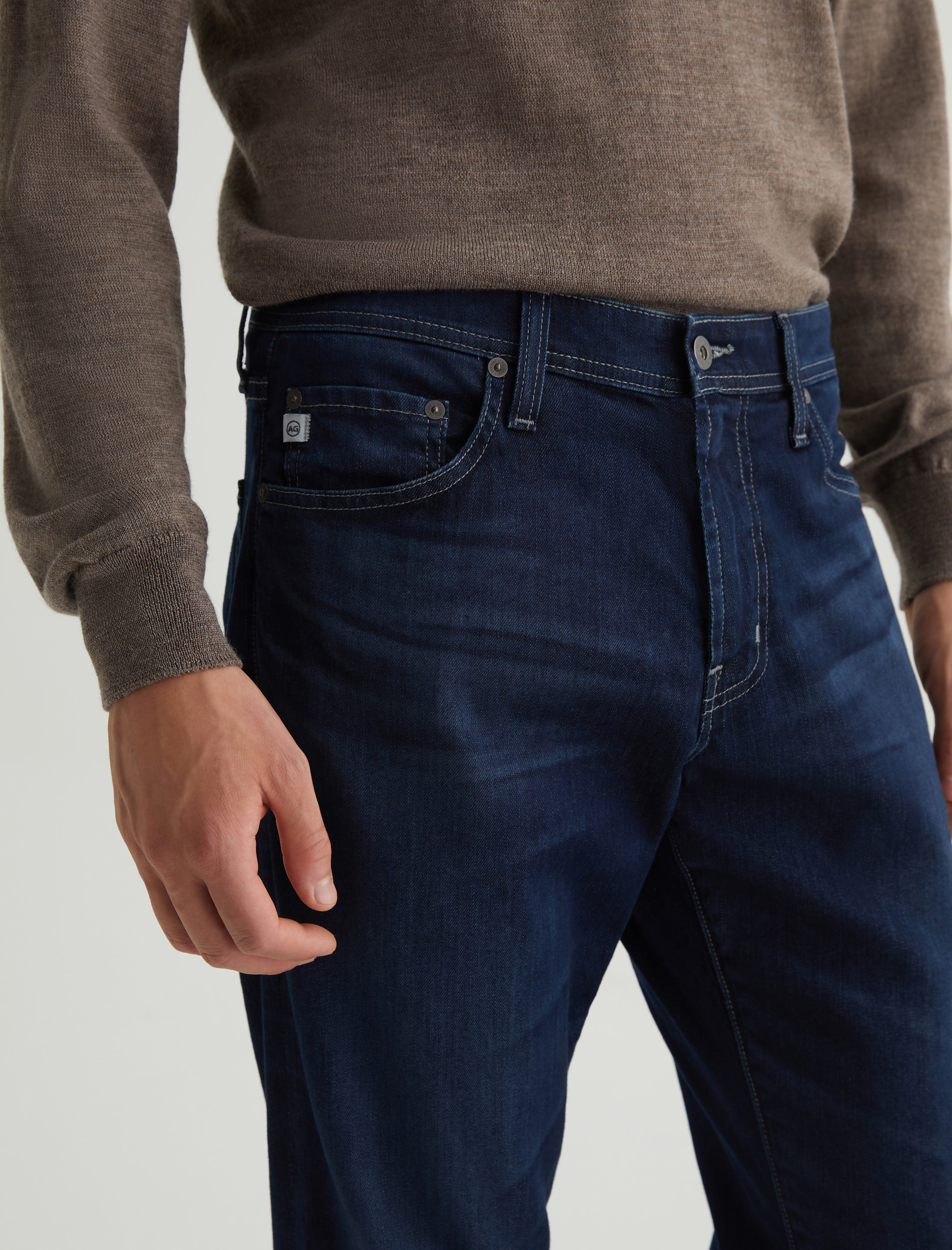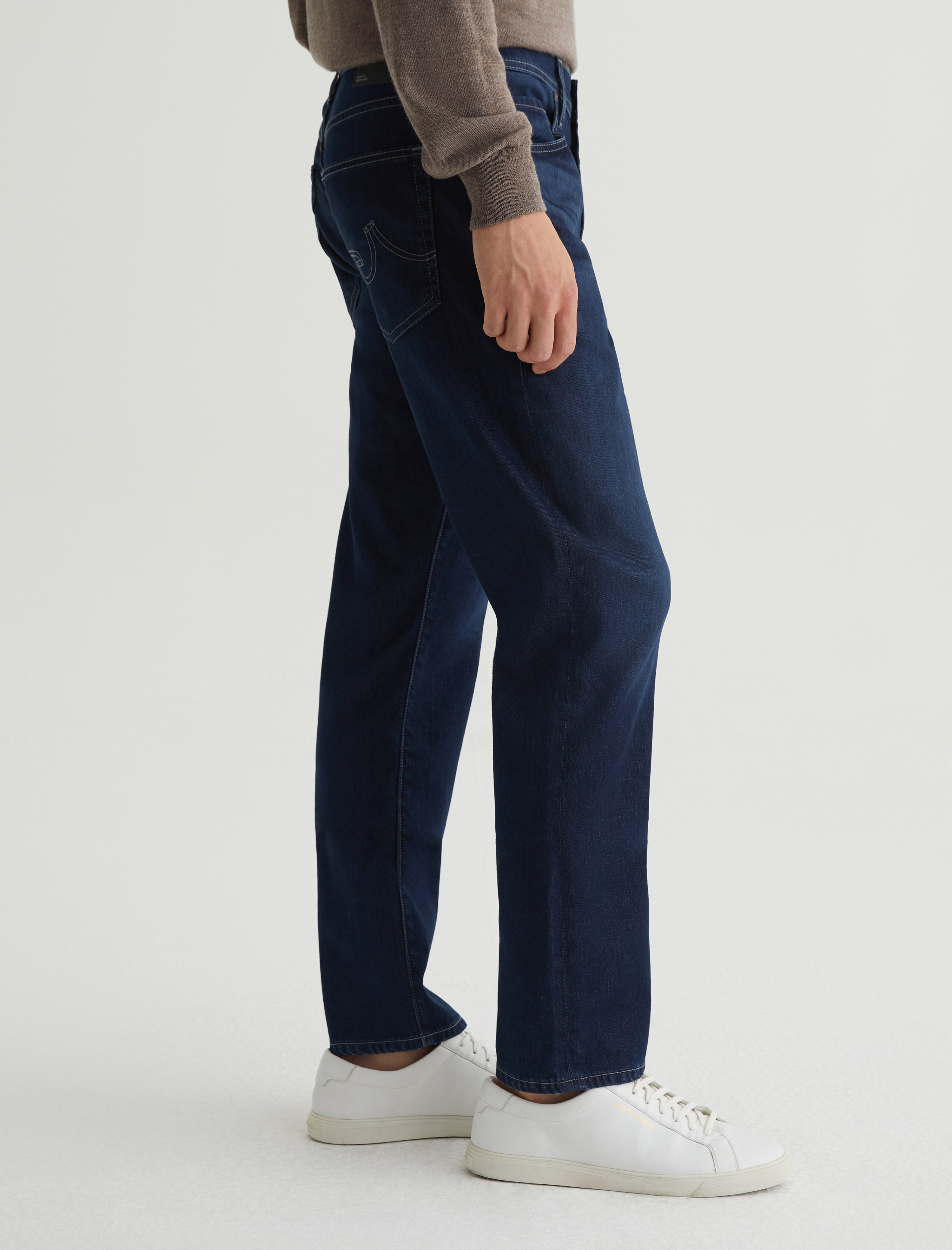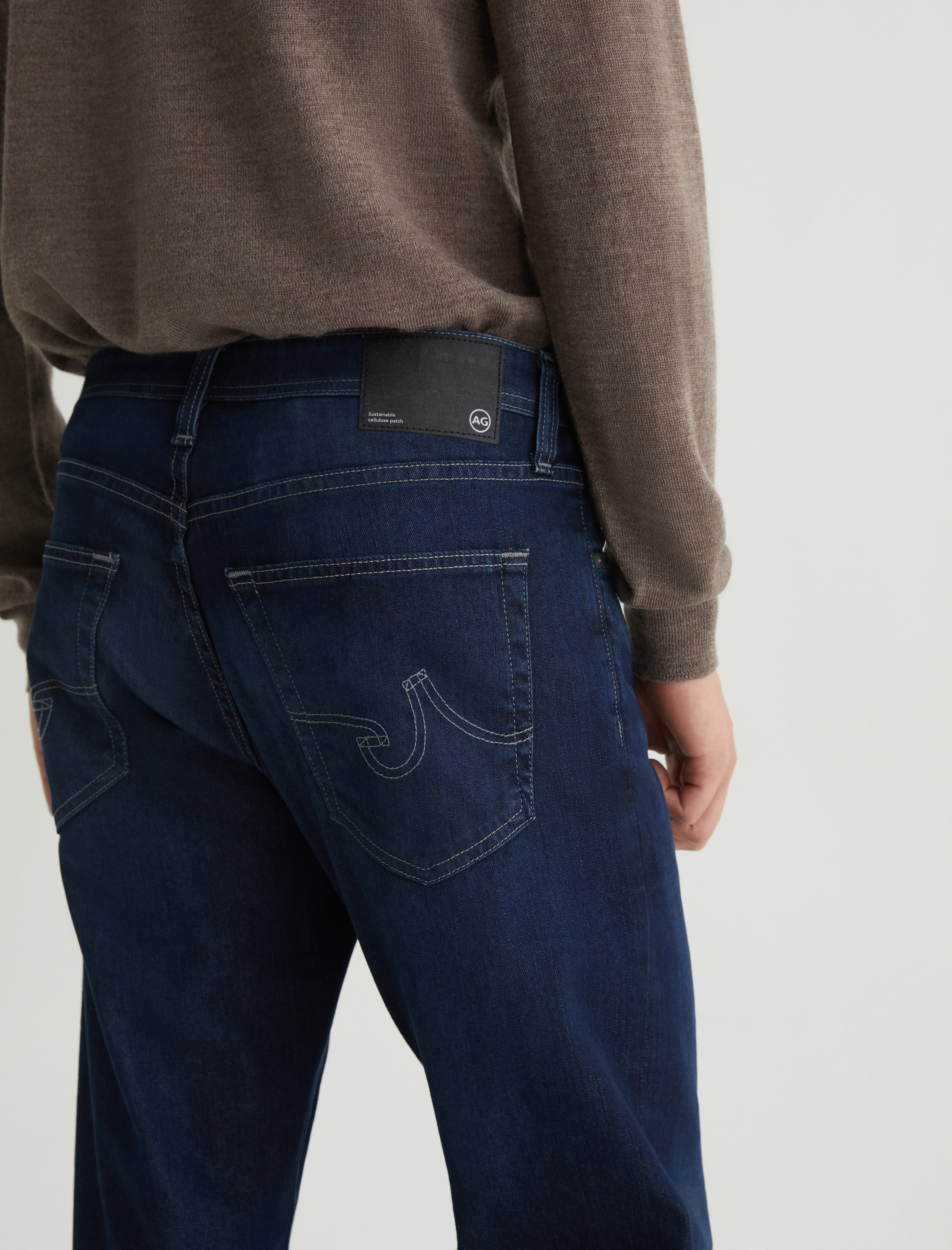 Everett is a slim straight fit for men, featured here in a dark wash with fading and whiskering. The style has a mid-rise waist and a straight fit that’s relaxed from hip to knee before slightly tapering at the leg opening. These men’s slim straight jeans are designed in 9 oz. Airluxe™ Aerial Nylon Denim made with comfort stretch and our eco-friendly AG Vapor Wash™ technology. The AG Vapor Wash™ process significantly reduces the use of water, chemicals, and energy to lessen environmental impact. Finished with a vegan and 100% biodegradable cellulose patch at the back waistband.