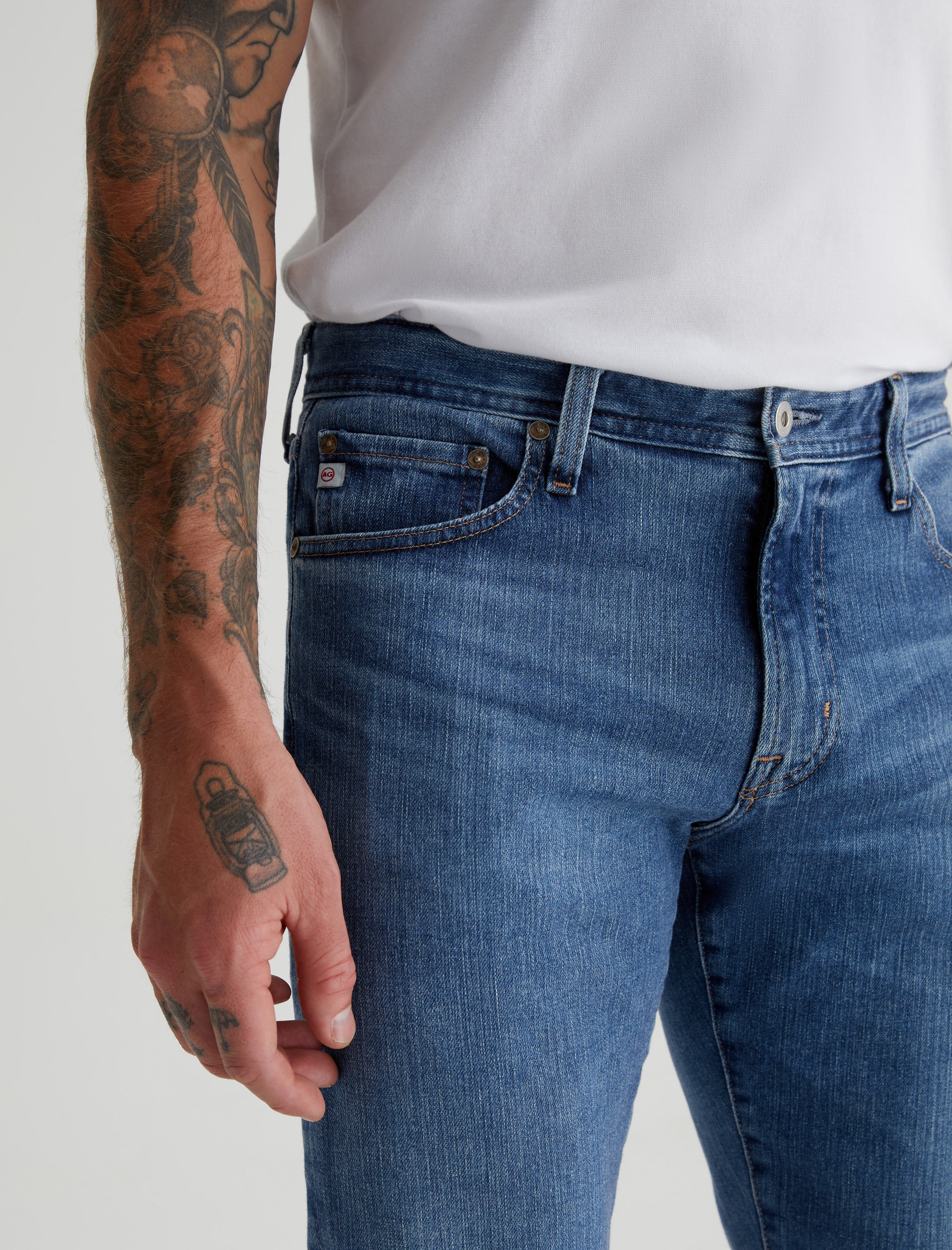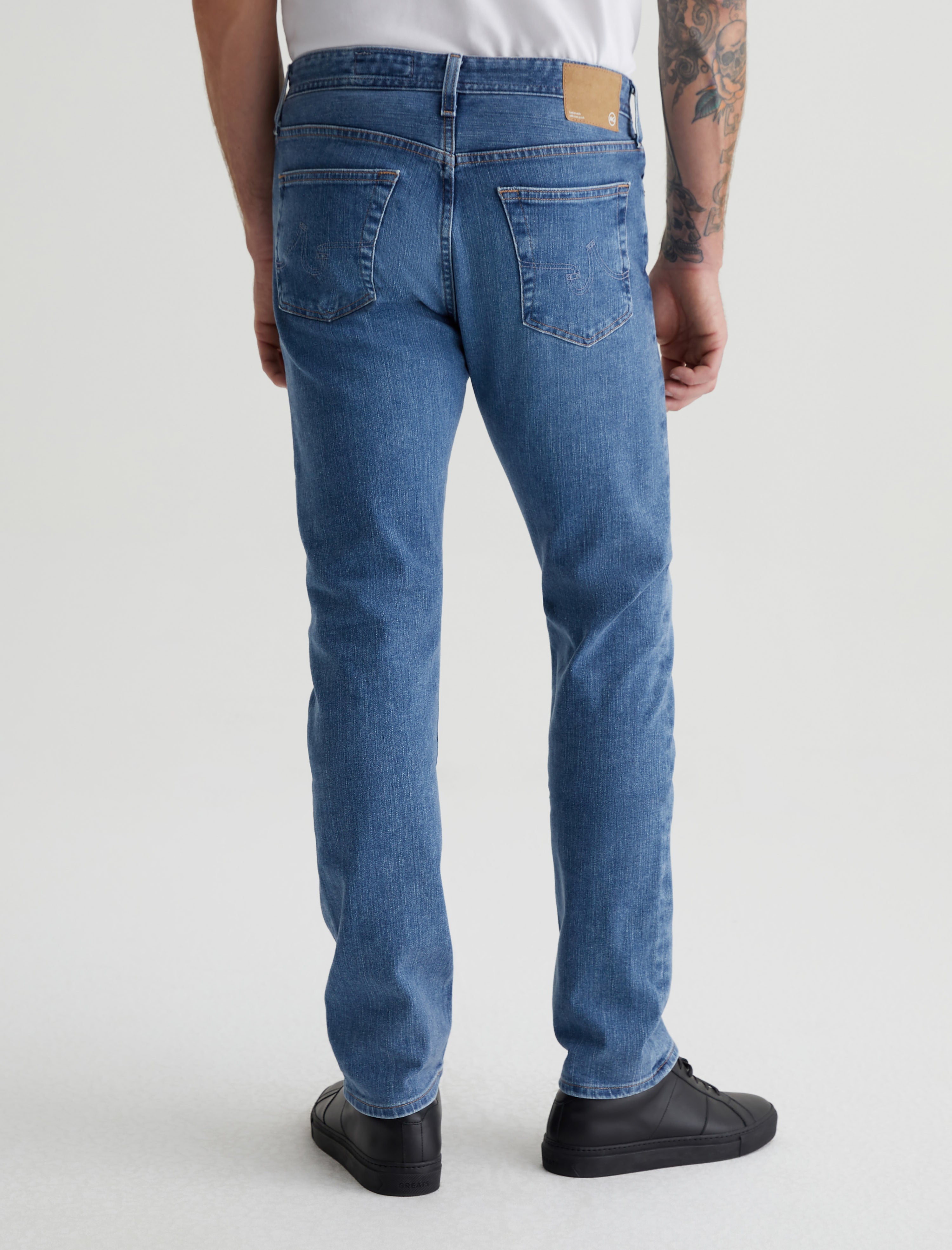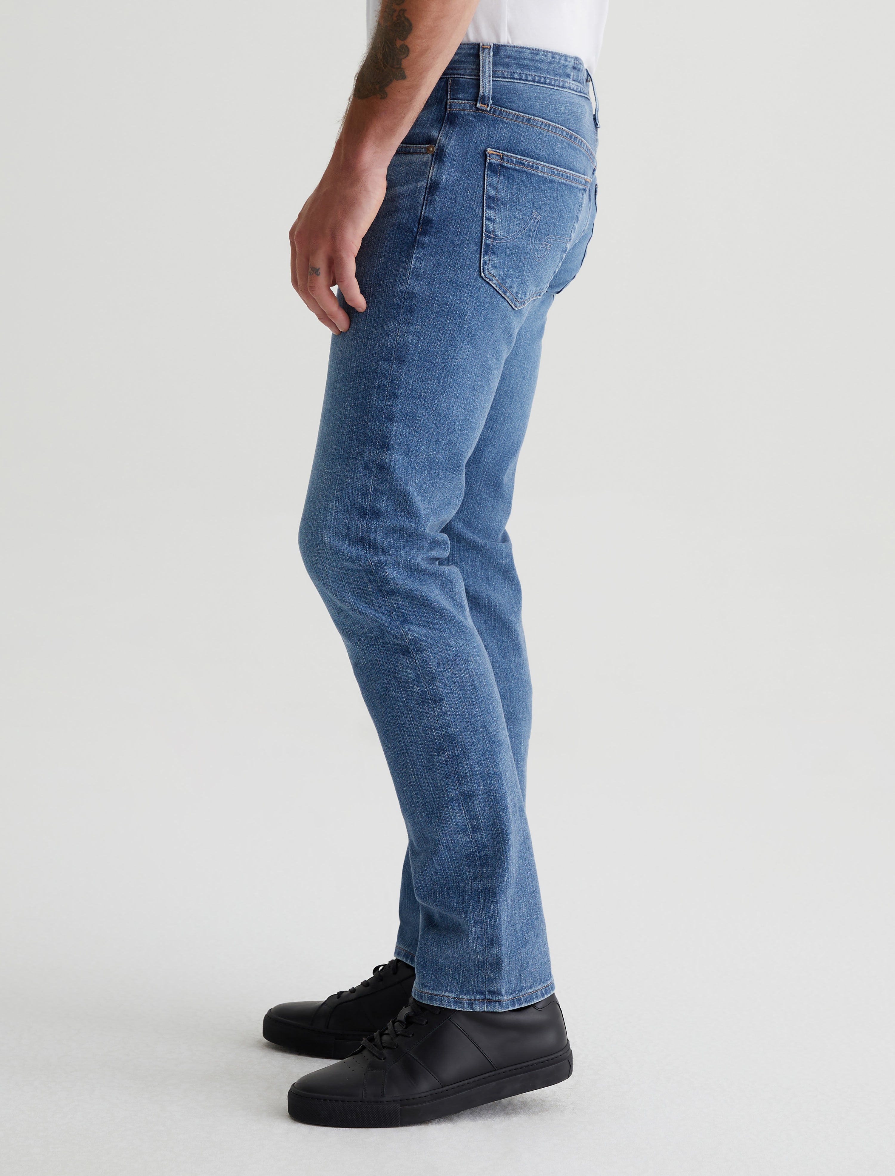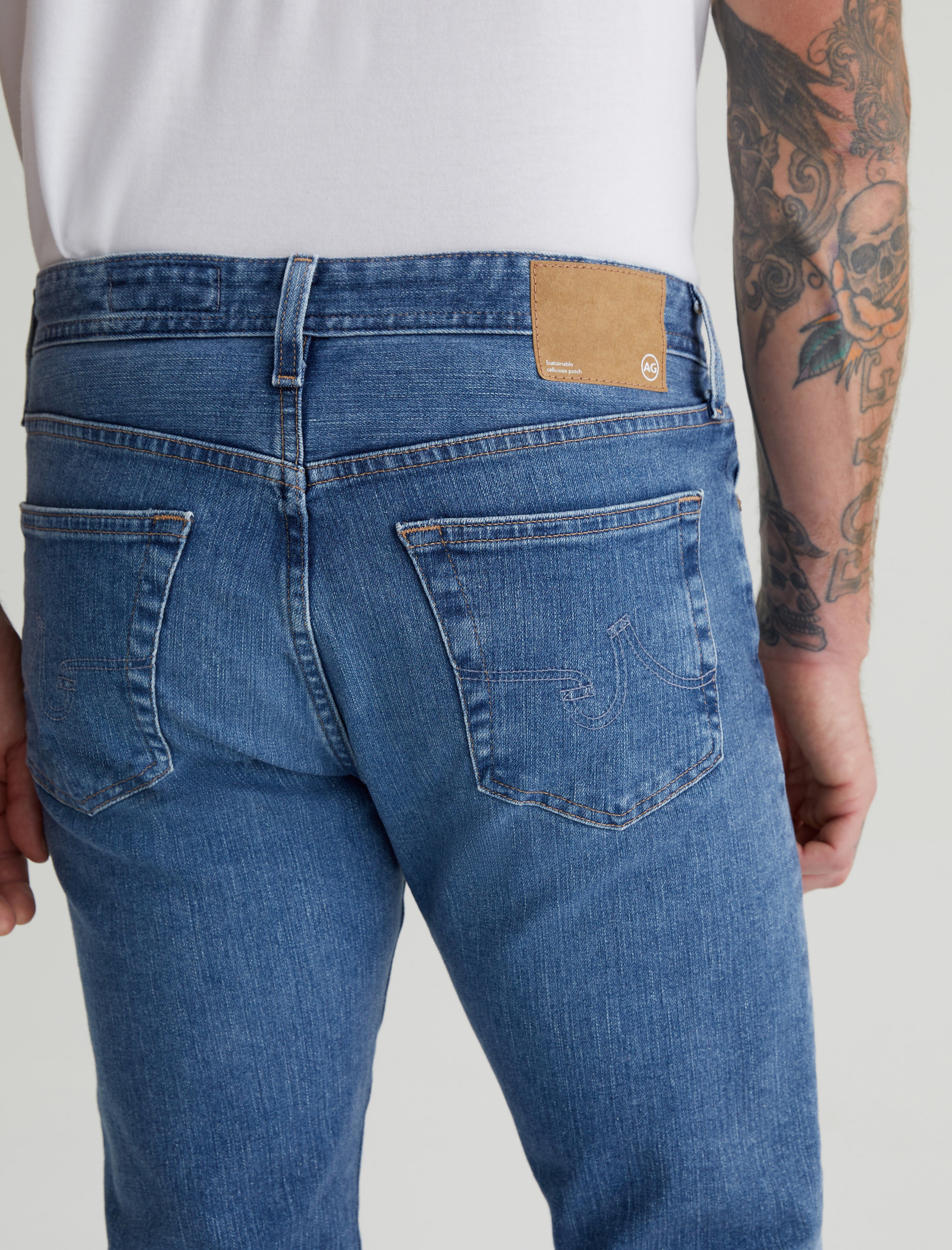 The Graduate is a pair of tailored-leg jeans for men, updated here in a faded light blue wash achieved through eco-friendly AG Vapor Wash™ technology. It's got a slim mid-rise waist and a relaxed fit from hip to knee before tapering at the leg opening. This five-pocket style is designed in 11.5 oz. 360° Denim with all-direction stretch. Our AG Vapor Wash™ process significantly reduces the use of water, chemicals, and energy to lessen environmental impact. Finished with a vegan and 100% biodegradable cellulose patch at the back waistband.