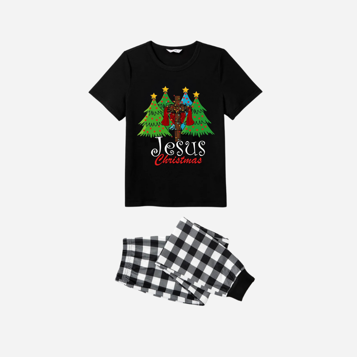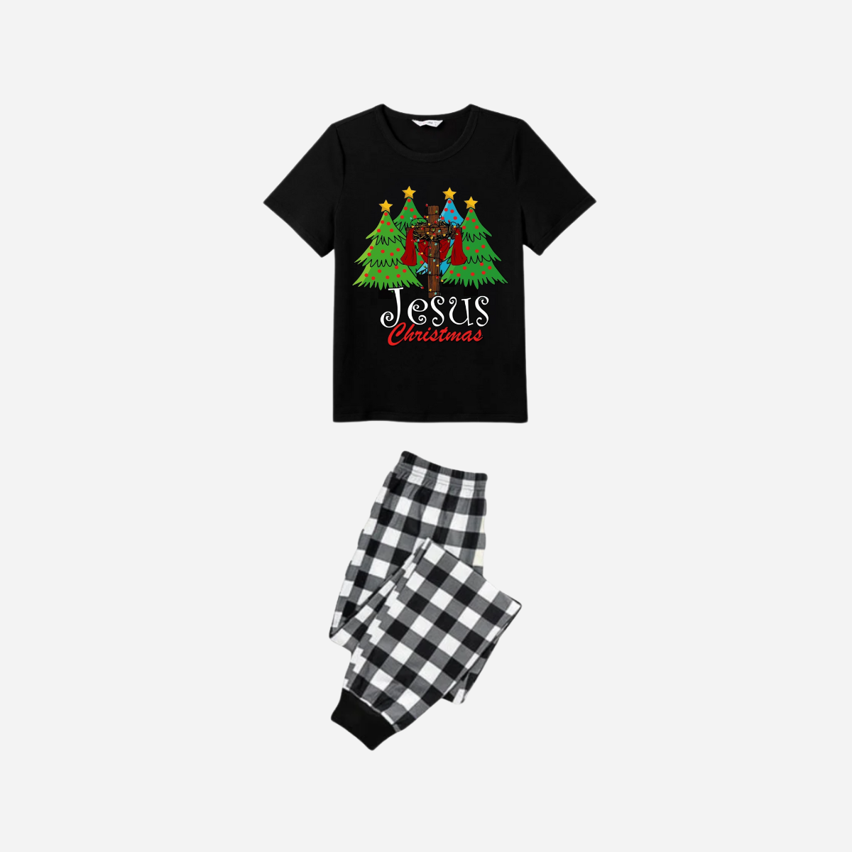 Jesus Christmas Family Matching Pajamas Set - Black Top with Black and White Plaid Pants