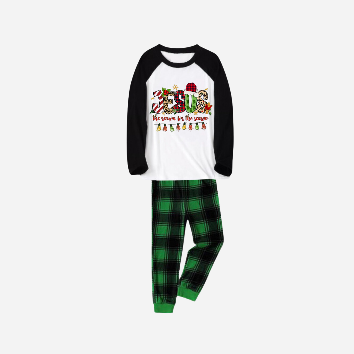 Jesus the Reason for the Season Family Christmas Pajamas Set - Black and White Top with Green Plaid Pants