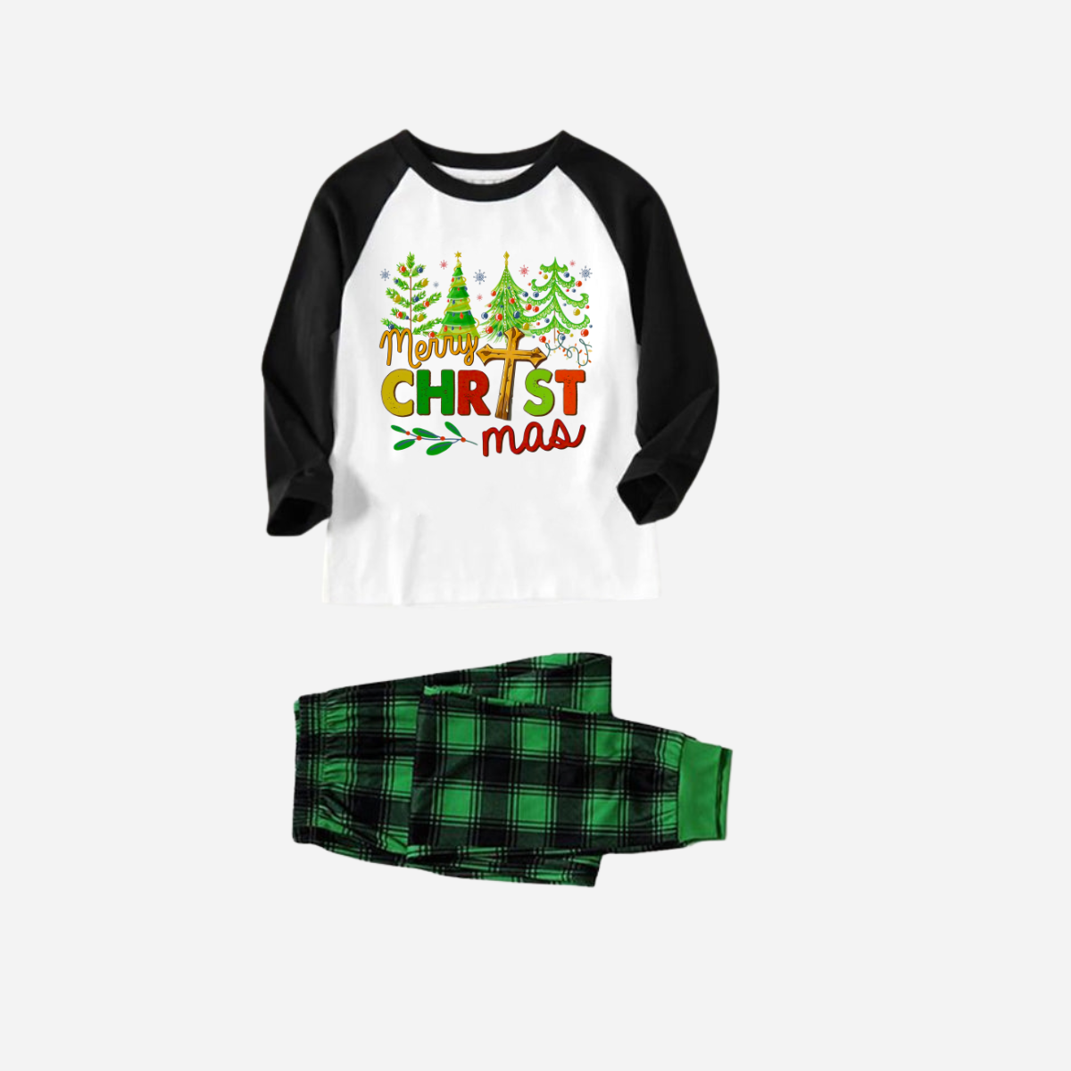 Merry Christmas Trees Family Christmas Pajamas Set - Black and White Top with Green Plaid Pants