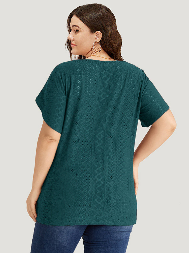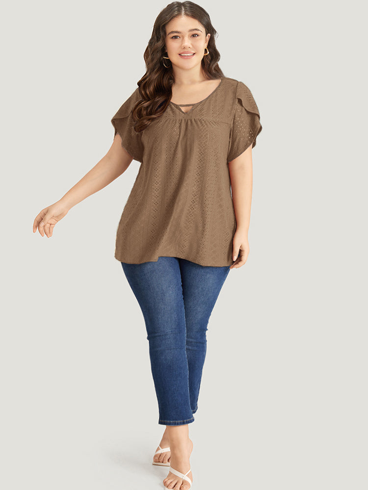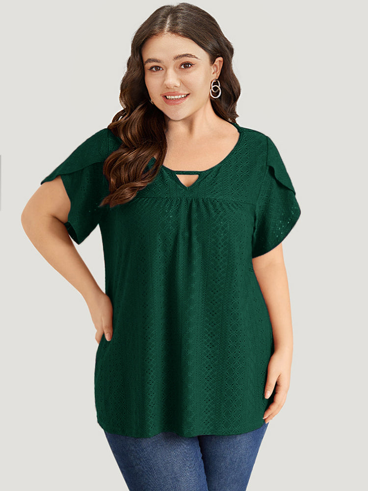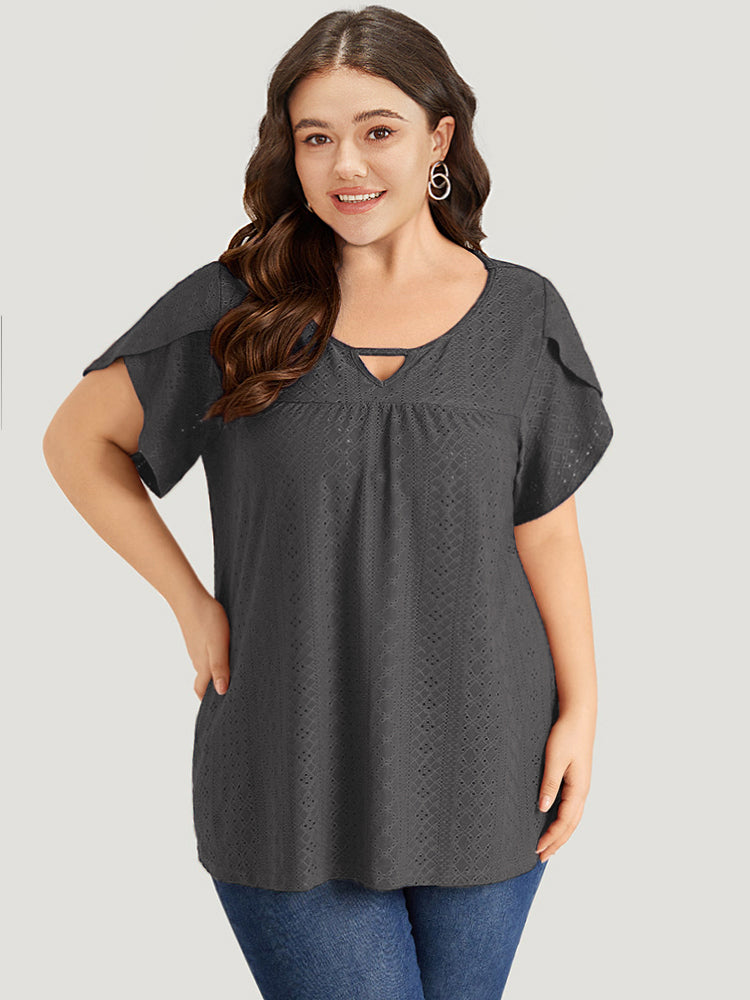 Plain Geometric Eyelet Keyhole Petal Sleeve T-shirt1006tees