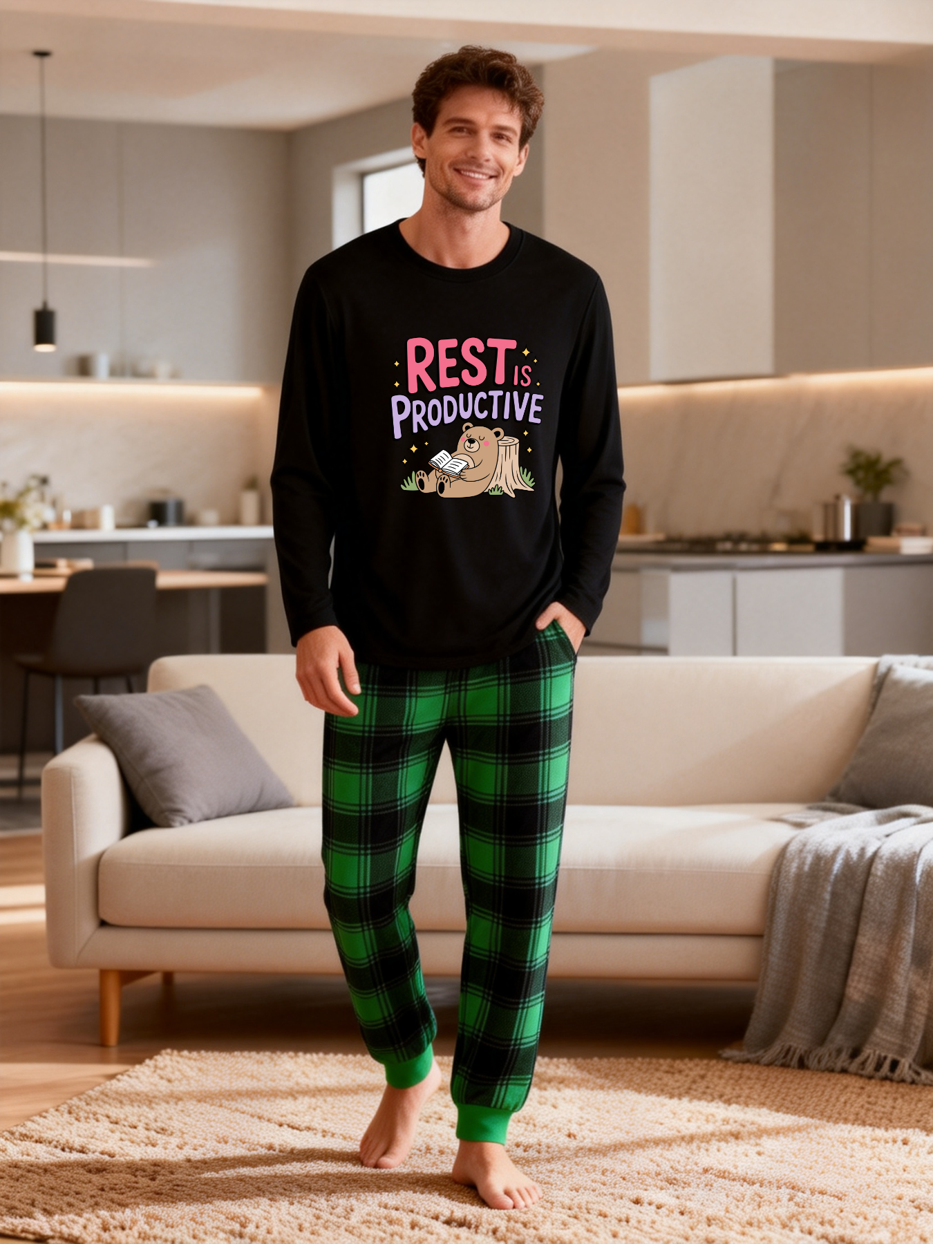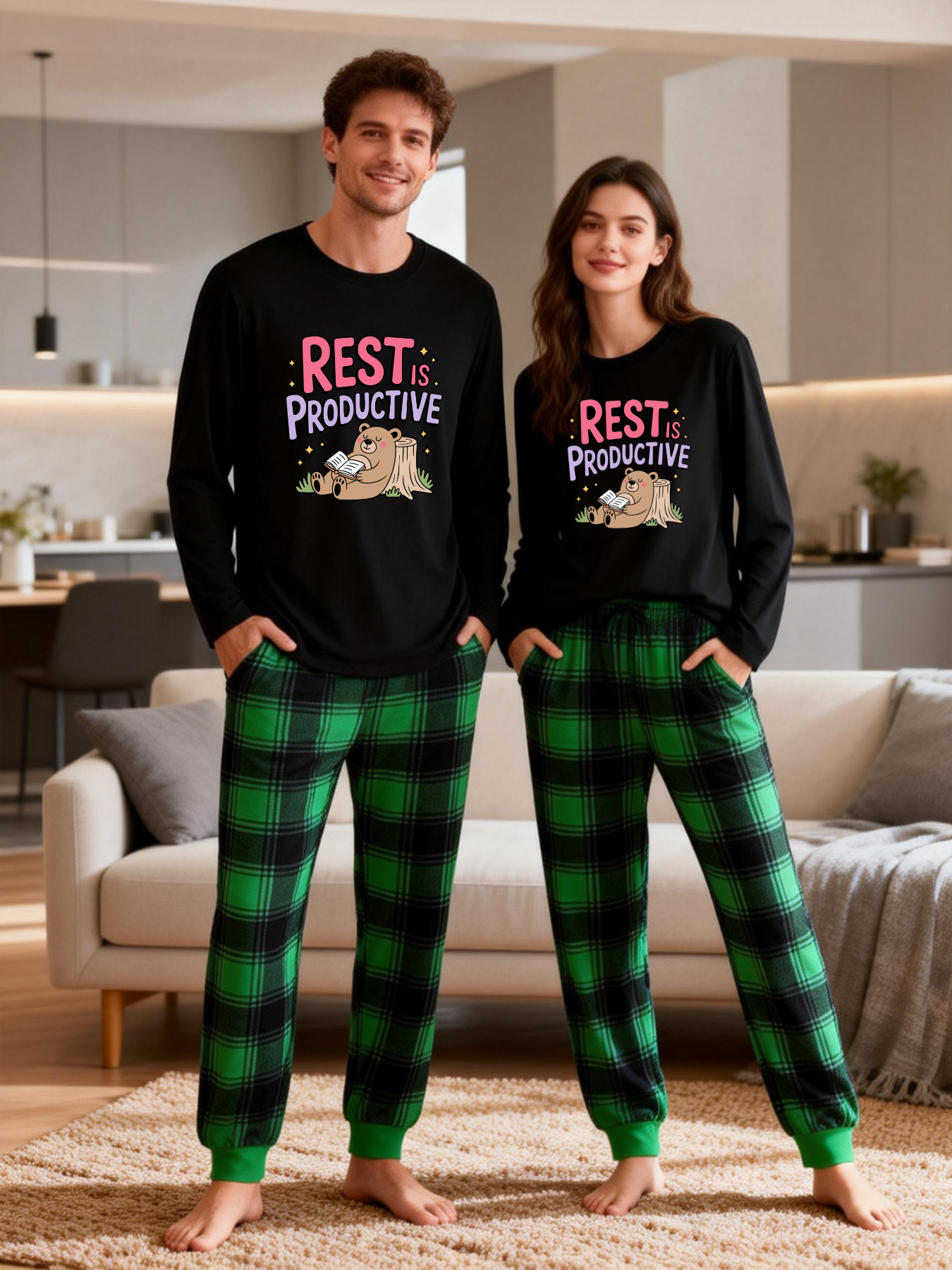 REST PRODUCTIVE Letter Printed Green Black Plaid Matching Pajamas