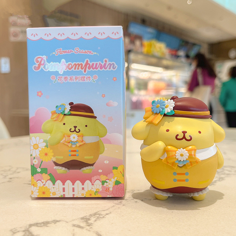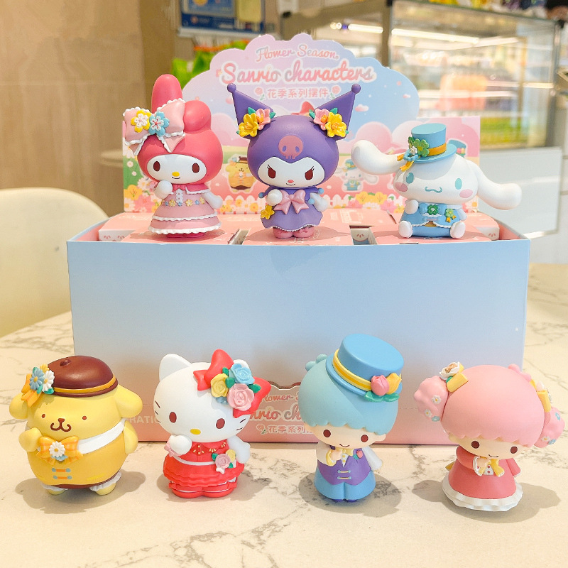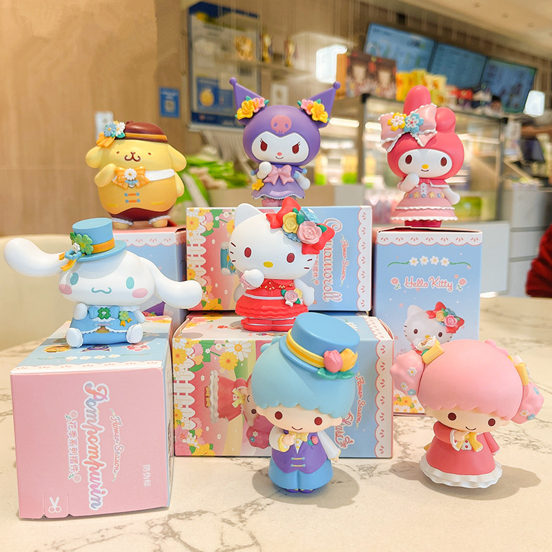 Introducing the whimsical Sanrio Flower Themed Figurine Collection, where beloved characters like Cinnamoroll, Pompompurin, My Melody, Little Twin Stars, and Kuromi come to life in their adorable floral-themed outfits! This delightful collection showcases the iconic Sanrio characters dressed in colorful floral attire, adding a touch of floral elegance to your collection.