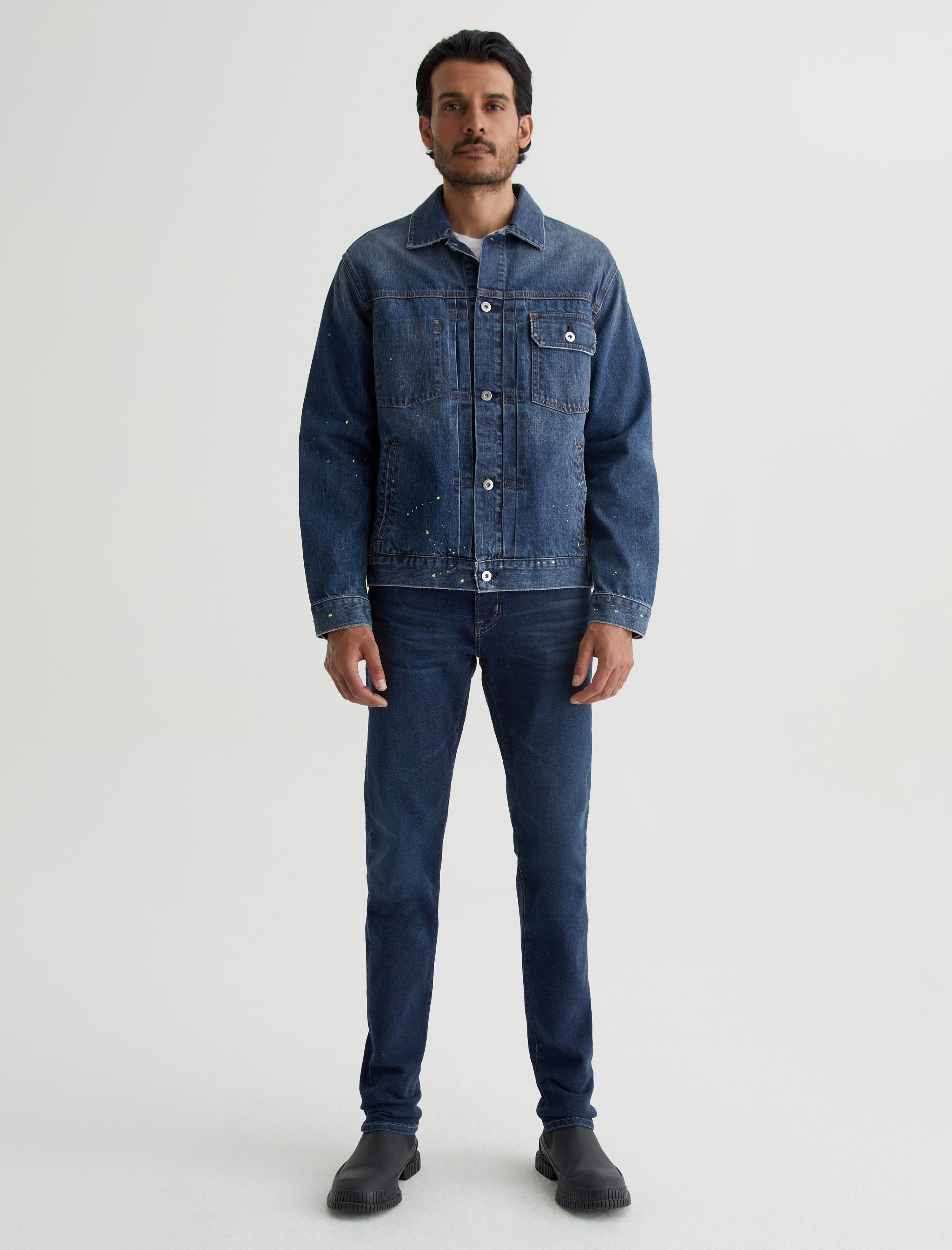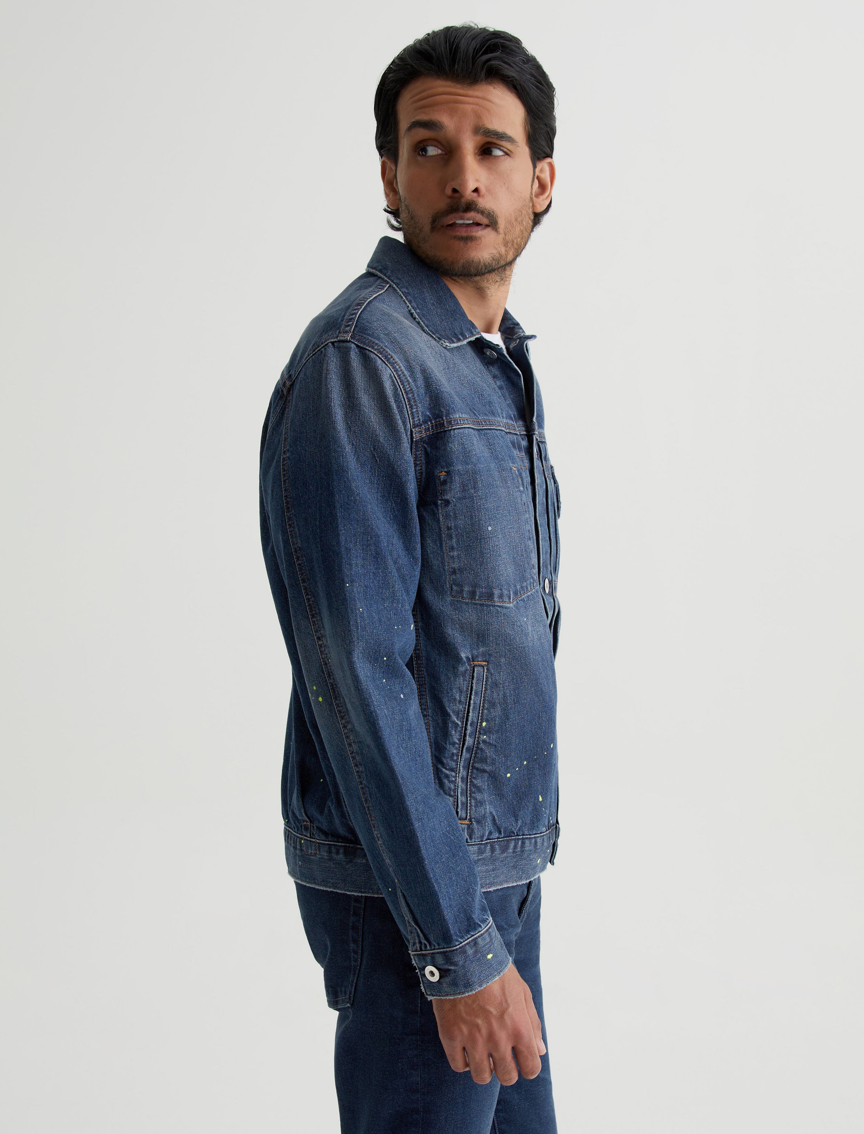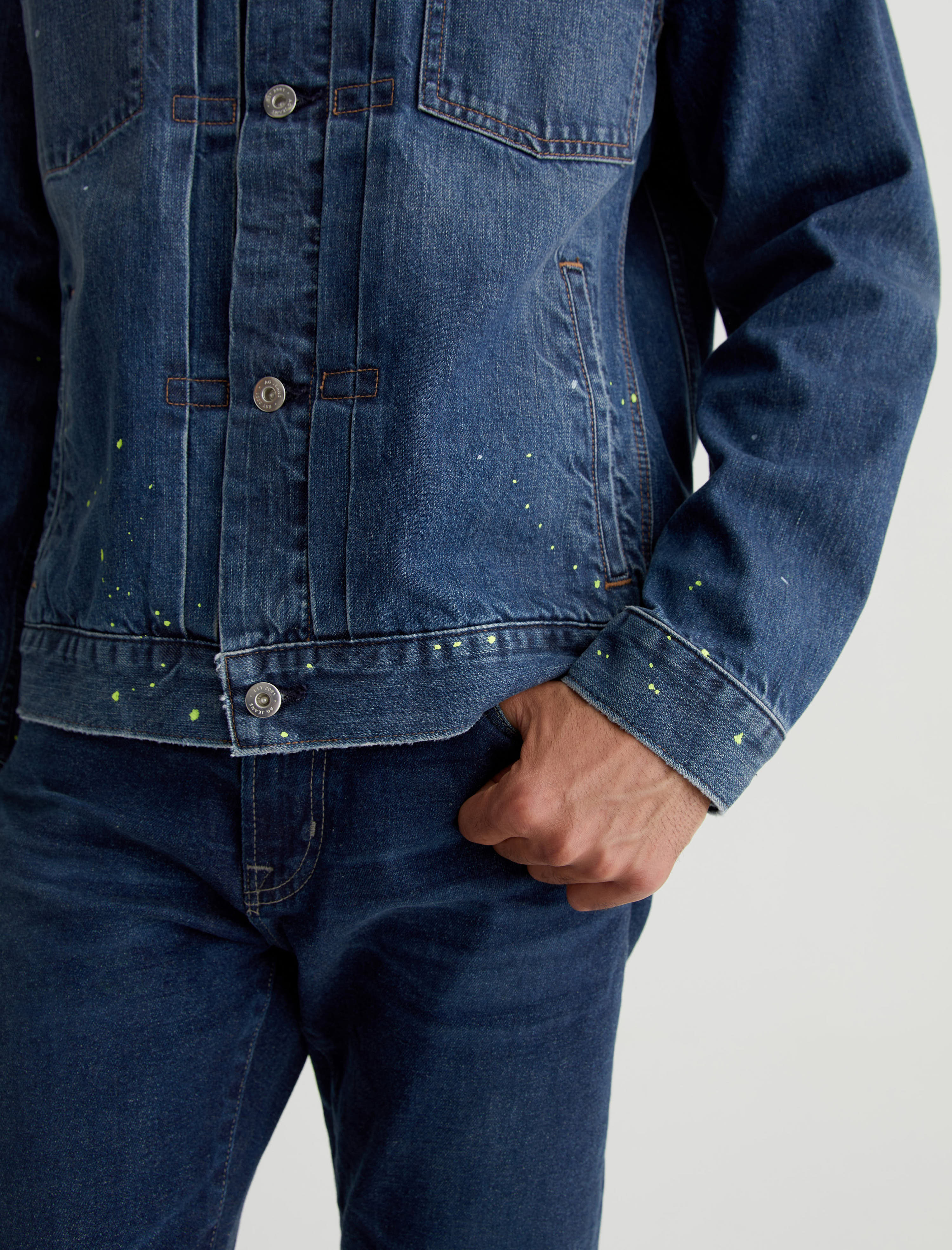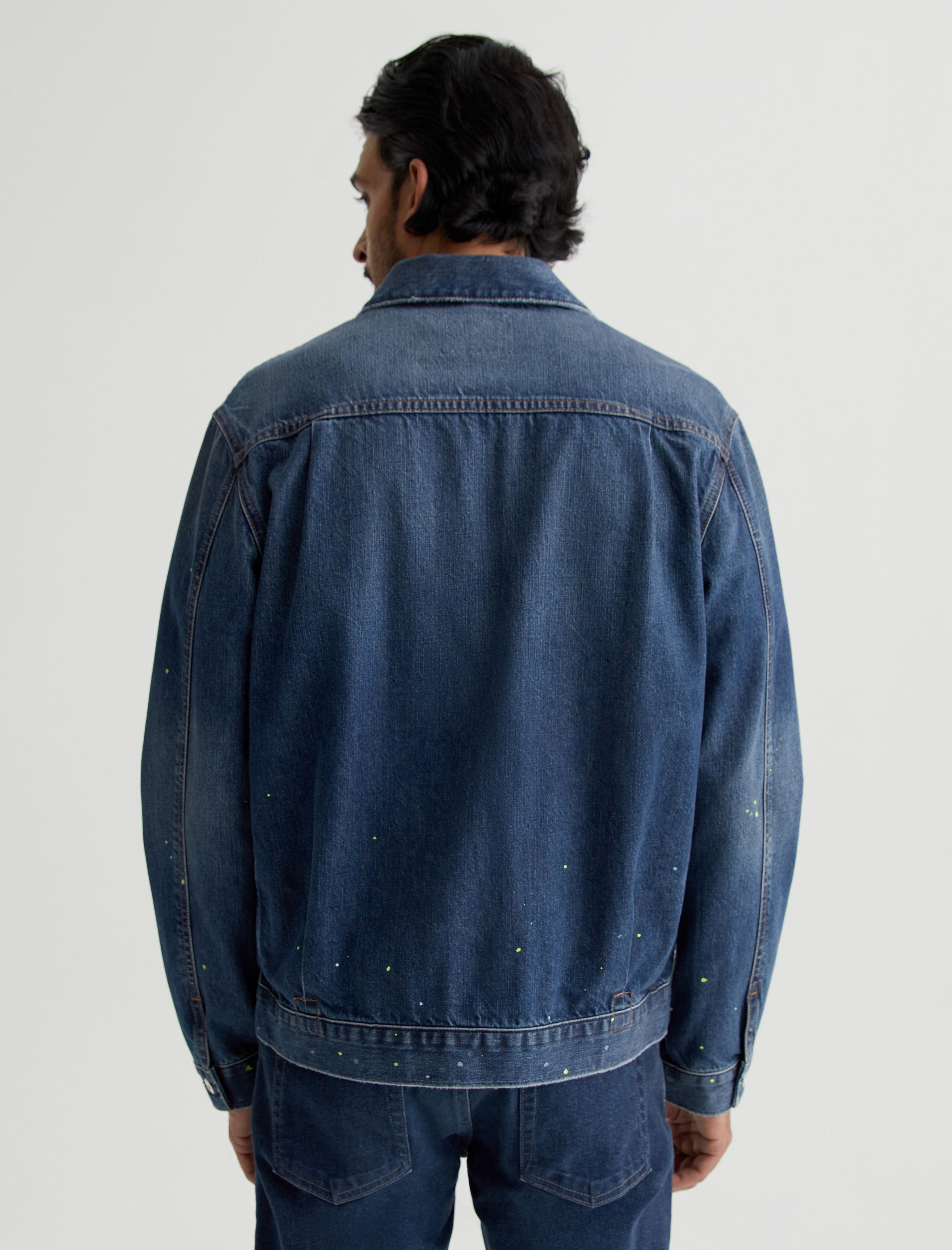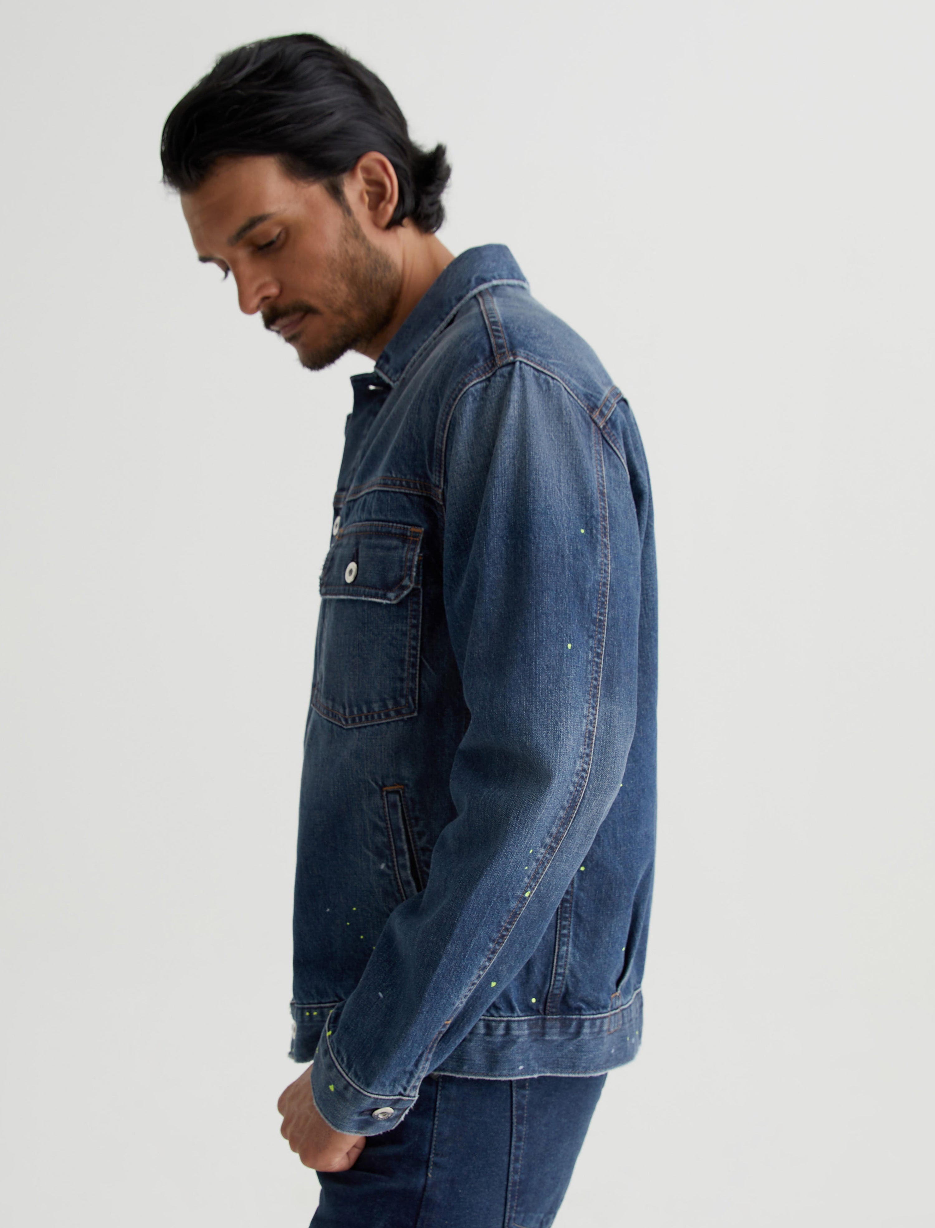 White and lime-hued paint flecks add a subtle pop of color to our Sid Jacket. A modern take on the classic trucker style, this men's jacket is made from 11.75 oz. Legion Denim with 100% cotton construction and a 8-year medium wash. Detailed by front pleating, marigold stitching, and multiple pockets to stash your essentials.