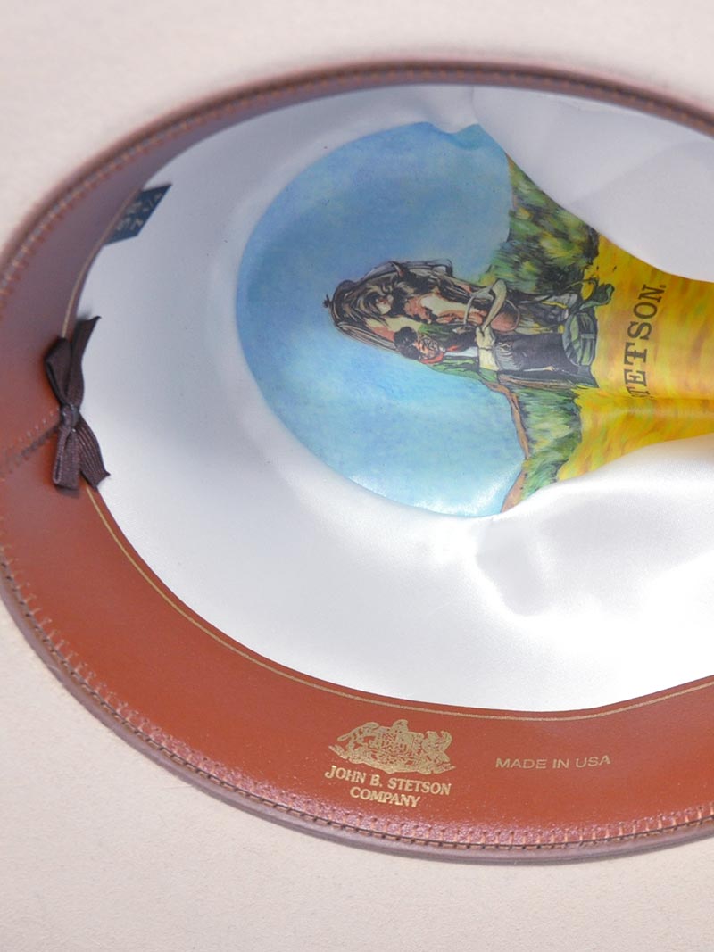 This hat is a part of Stetsons Legendary Collection, featuring a loosely woven brown leather hat band.