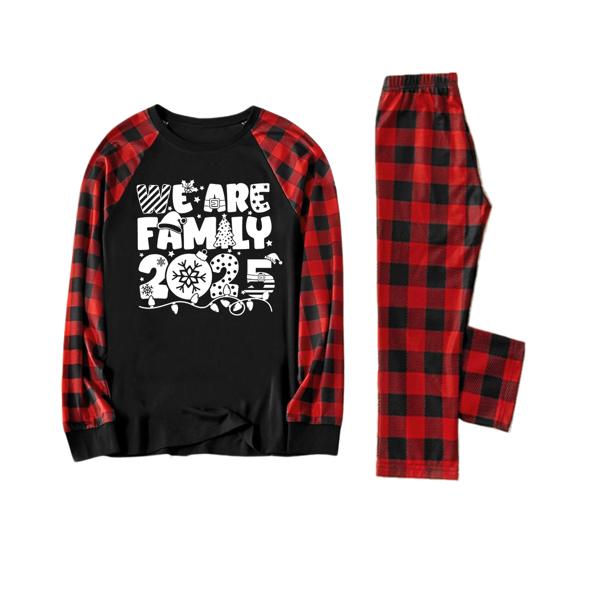 "We are Family 2025" White Letter Print Black & Red Plaid Family Matching Black Pajamas