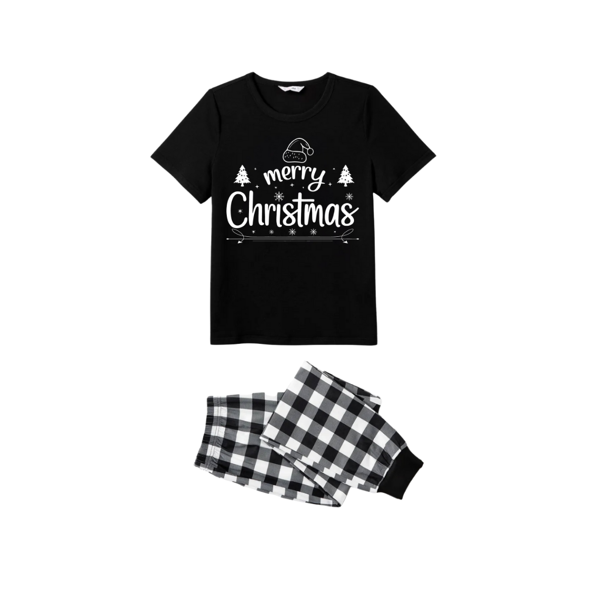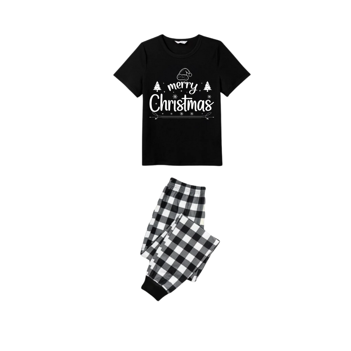 We Wish You a Merry Christmas Tree Family Pajamas Set - Black Top Black and White Plaid Pants Holiday Graphic