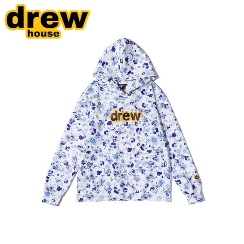 Drew house smiley face blue and white porcelain cloud full printed LOGO hooded stitching thin cotton sweatshirt