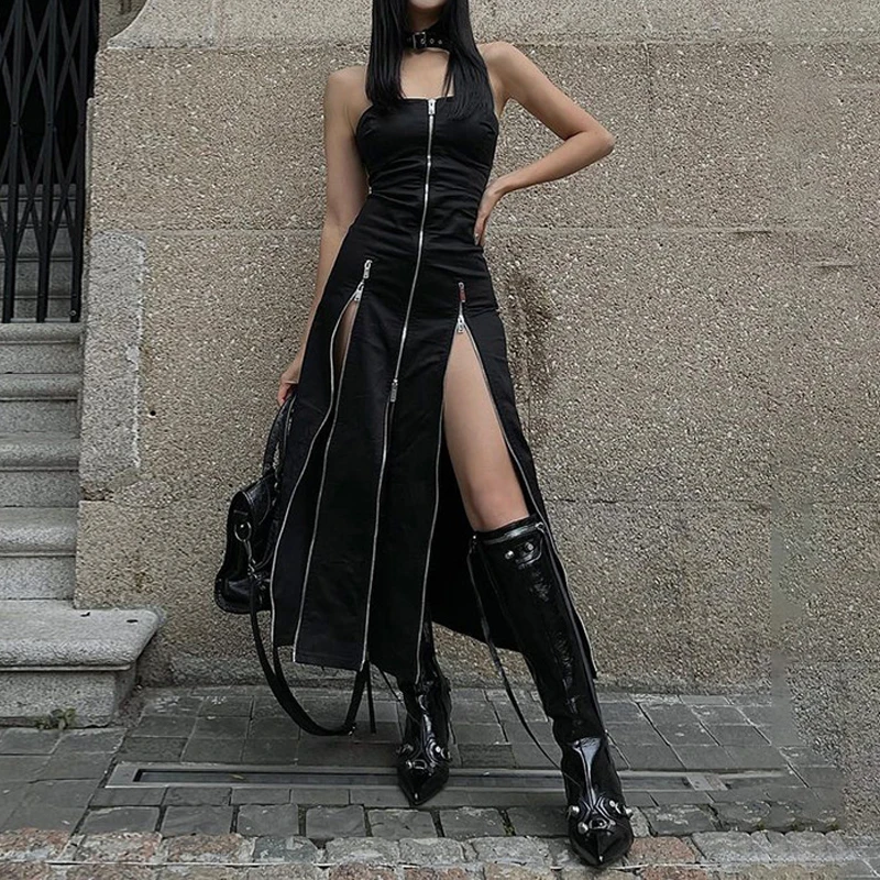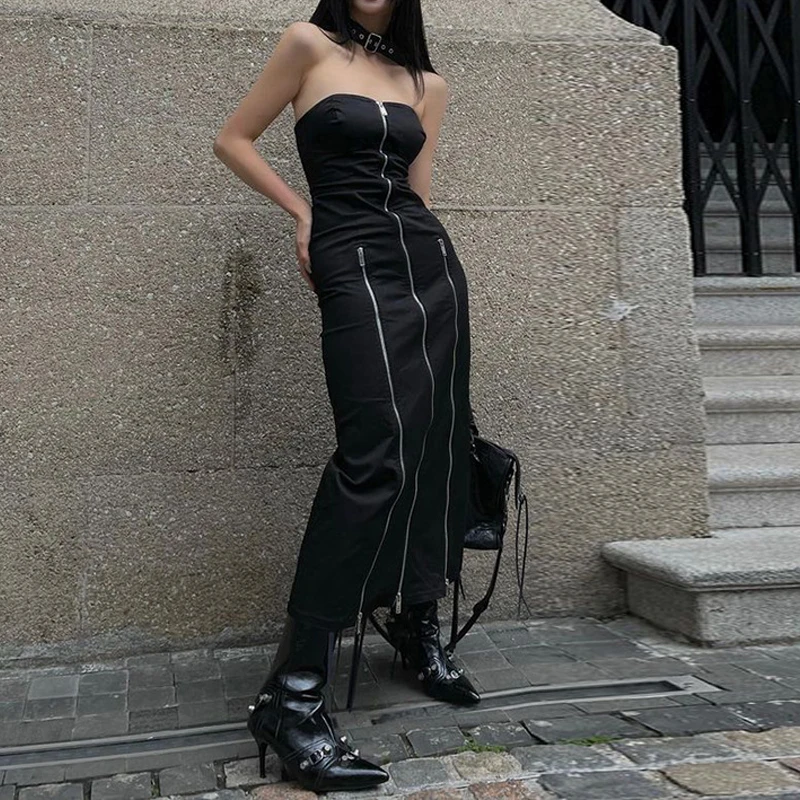 Gothic Zip Up Midi Dresses Split Tube Off Shoulder Dress