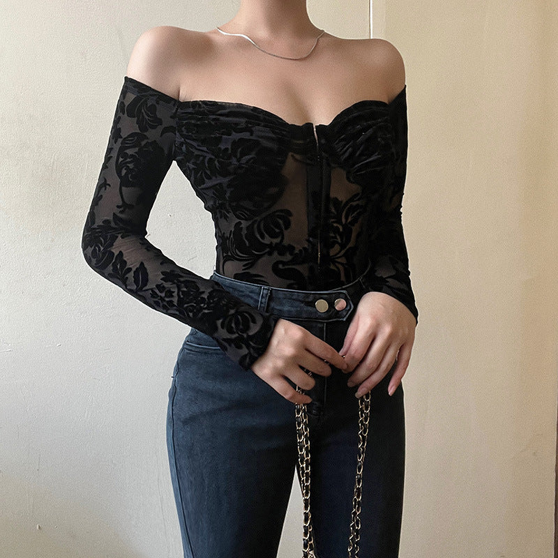Women Long Sleeve Off Shoulder Lace Floral Bodysuit