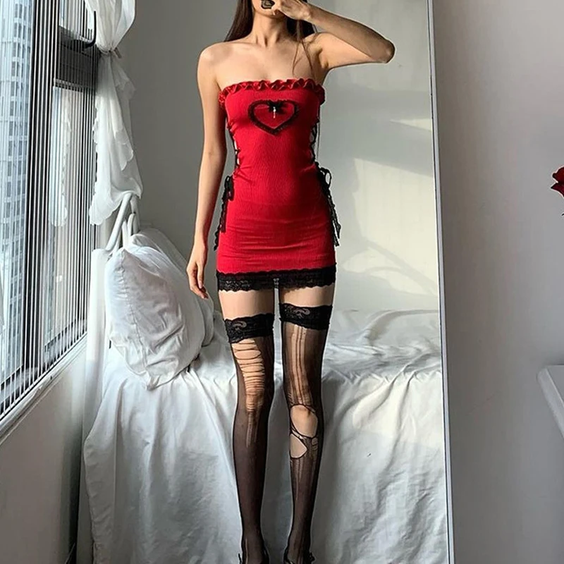 Gothic Hollow Out Ruffles Lace Trim Wrap Skinny Backless Bandage Dress