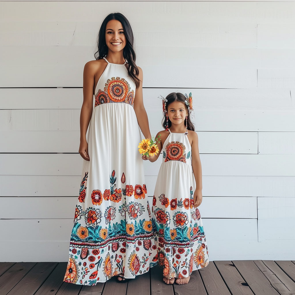 Step into the world of bohemian style with these exquisite mother and daughter matching boho halter long dresses! Featuring a trendy halter neckline and a flowing silhouette, these dresses exude a laid-back yet elegant vibe that is perfect for warm-weather gatherings or casual outings. The bohemian-inspired design adds a touch of free-spirited charm to your look, making you and your little one stand out in style. Crafted from lightweight and breathable fabric, these dresses ensure comfort and ease of movement for both mom and daughter. Embrace the spirit of togetherness and fashion with these stunning matching boho dresses that will elevate your matching outfit game to a whole new level!