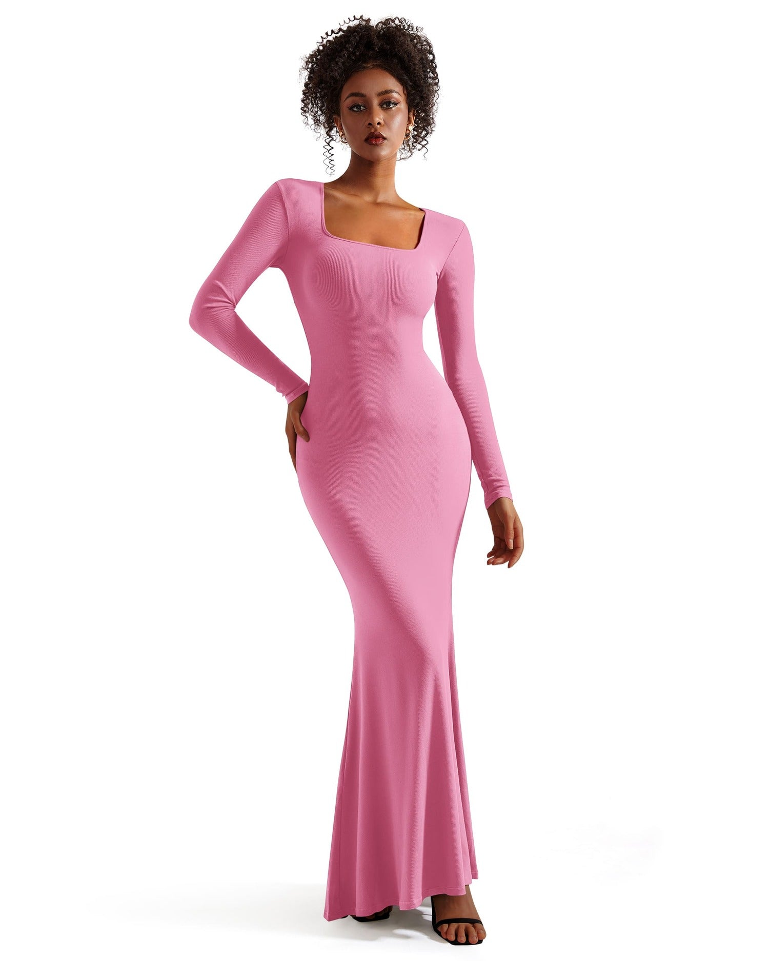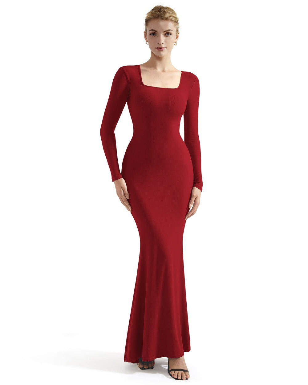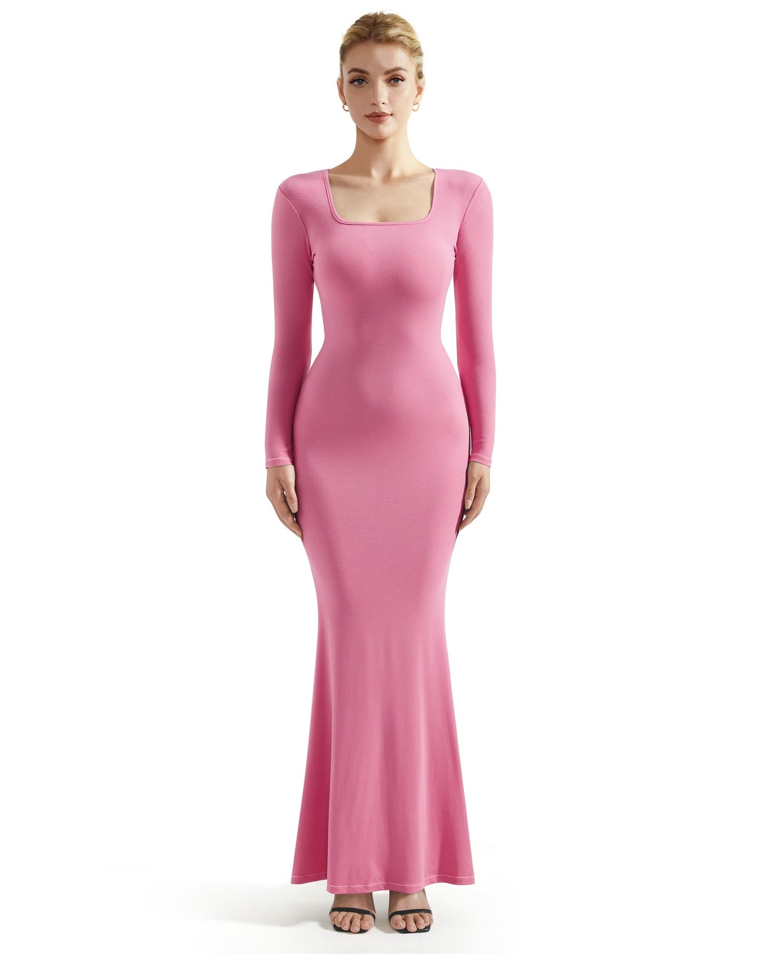 Ribbed Maxi Square Neck Dress - Long Sleeve