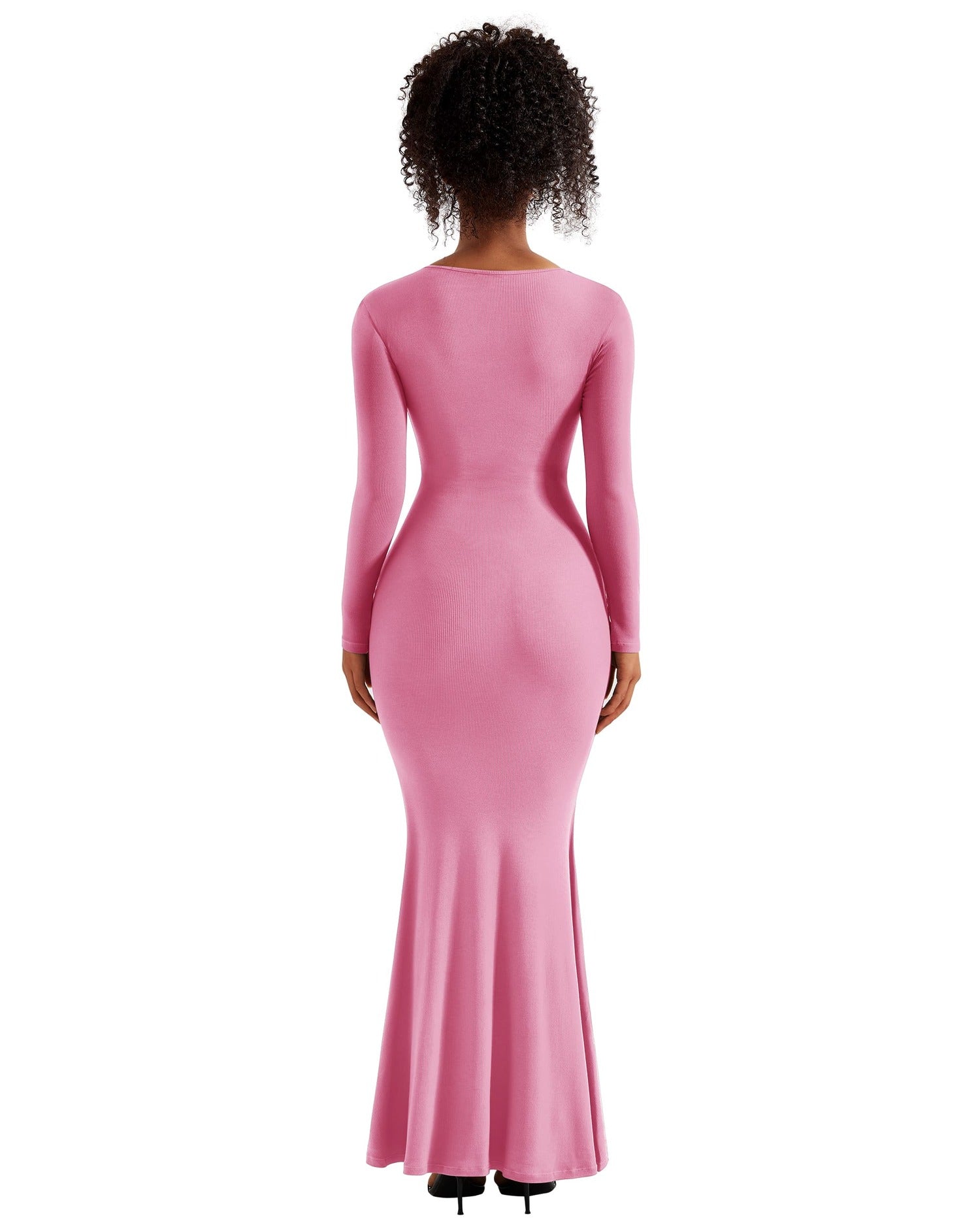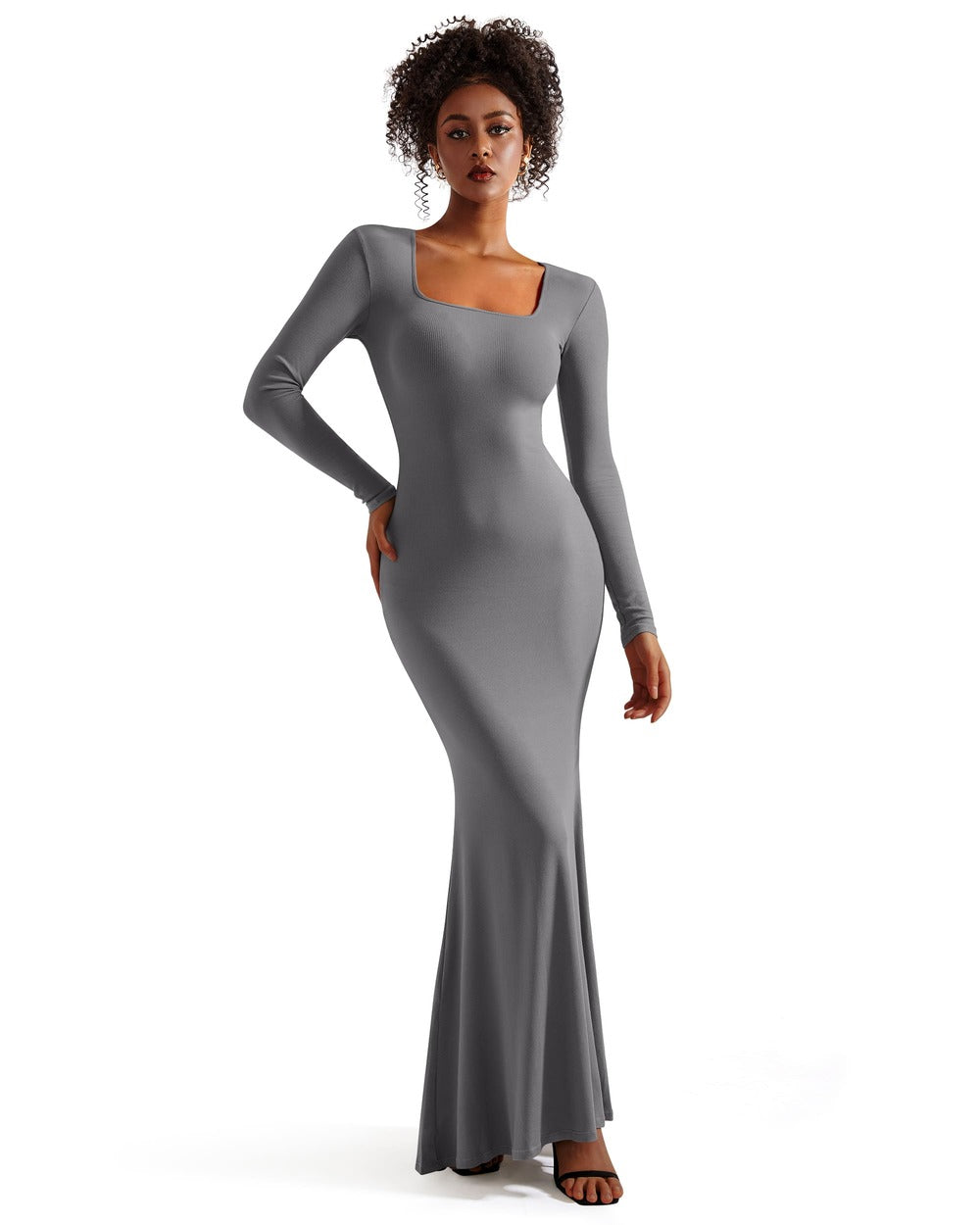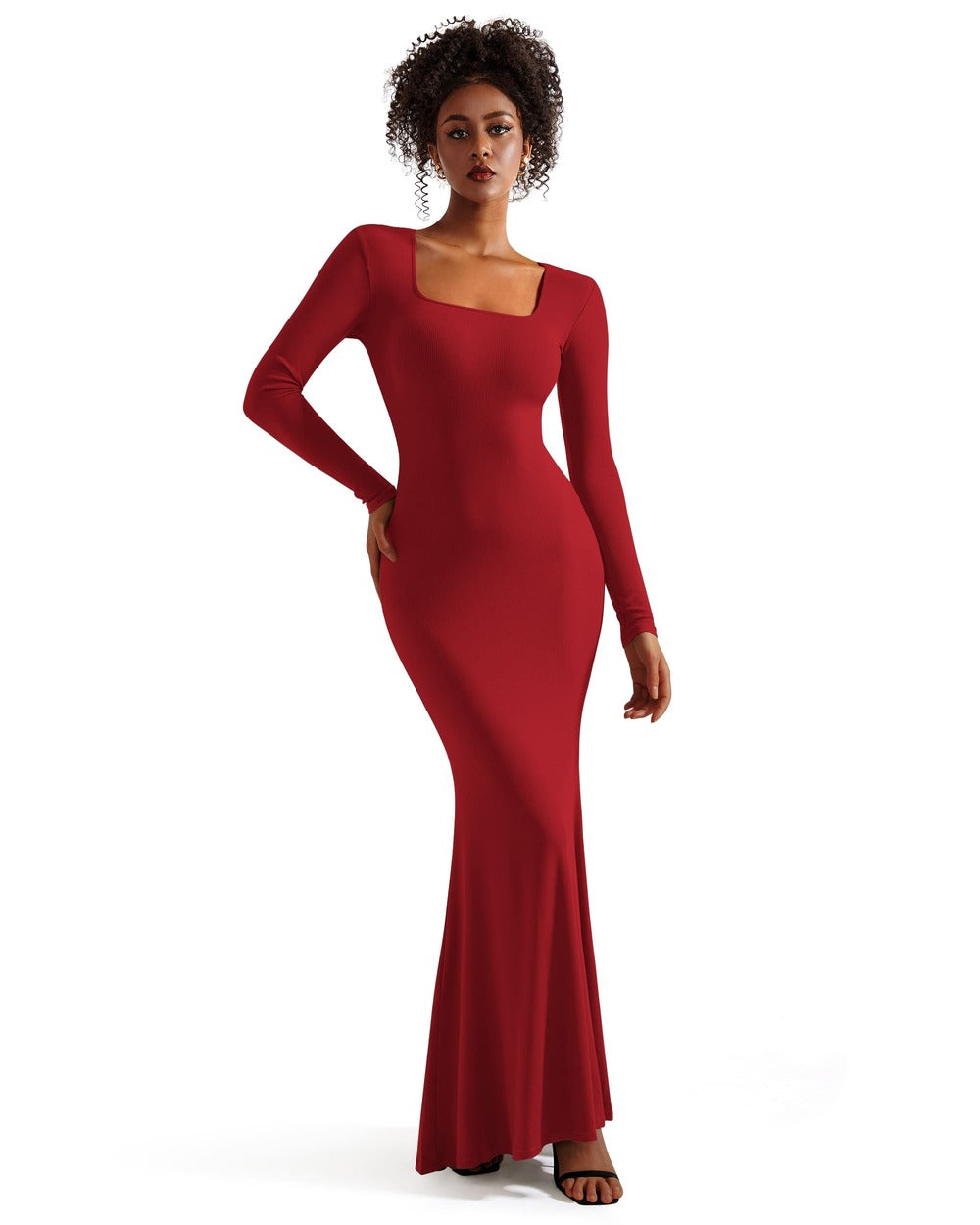 Ribbed Maxi Square Neck Dress - Long Sleeve